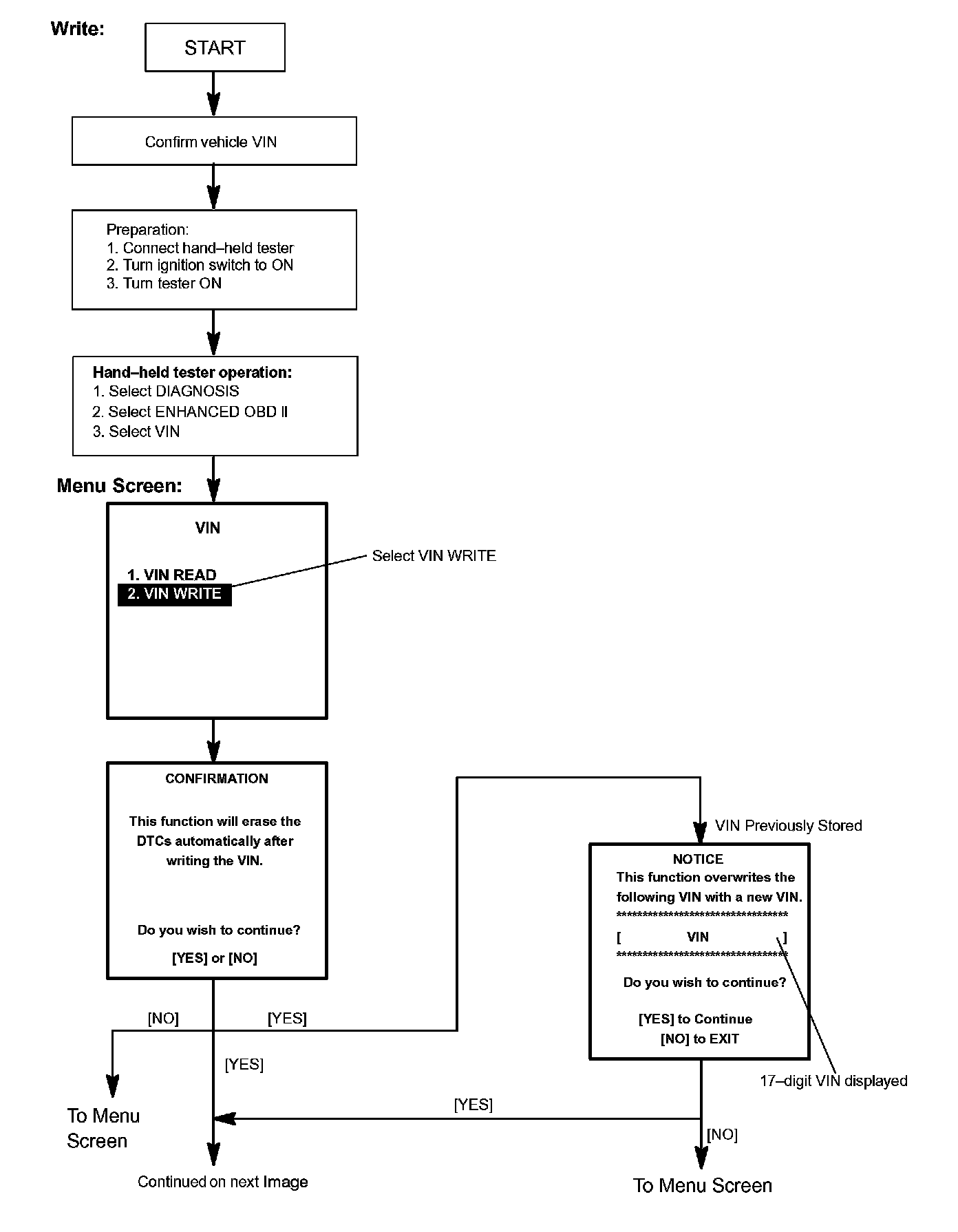 c. Write VIN: Explains the VIN writing process in a flowchart. This process allows the VIN to be input into the ECM. If the ECM is changed, or the VIN and VIN do not match, the VIN can be registered, or overwritten in the ECM by following this procedure.