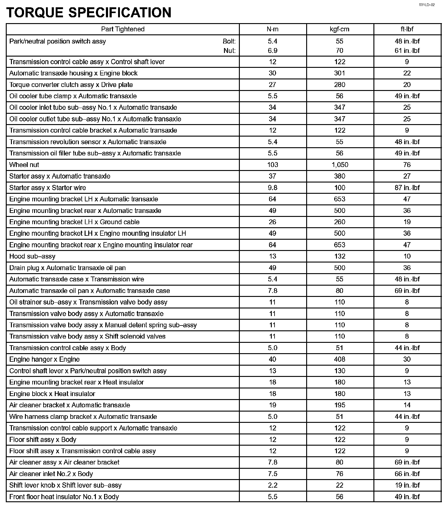 Automatic Transmission / Transaxle - Torque Specification: