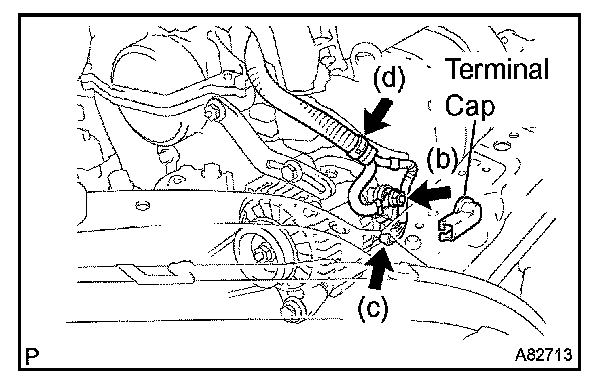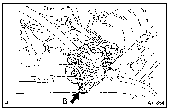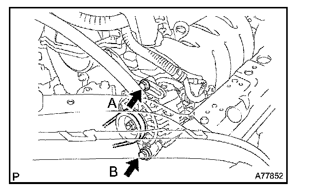 b. Temporarily install the fan belt adjusting bar with bolt A, and tighten the nut to the specified torque.