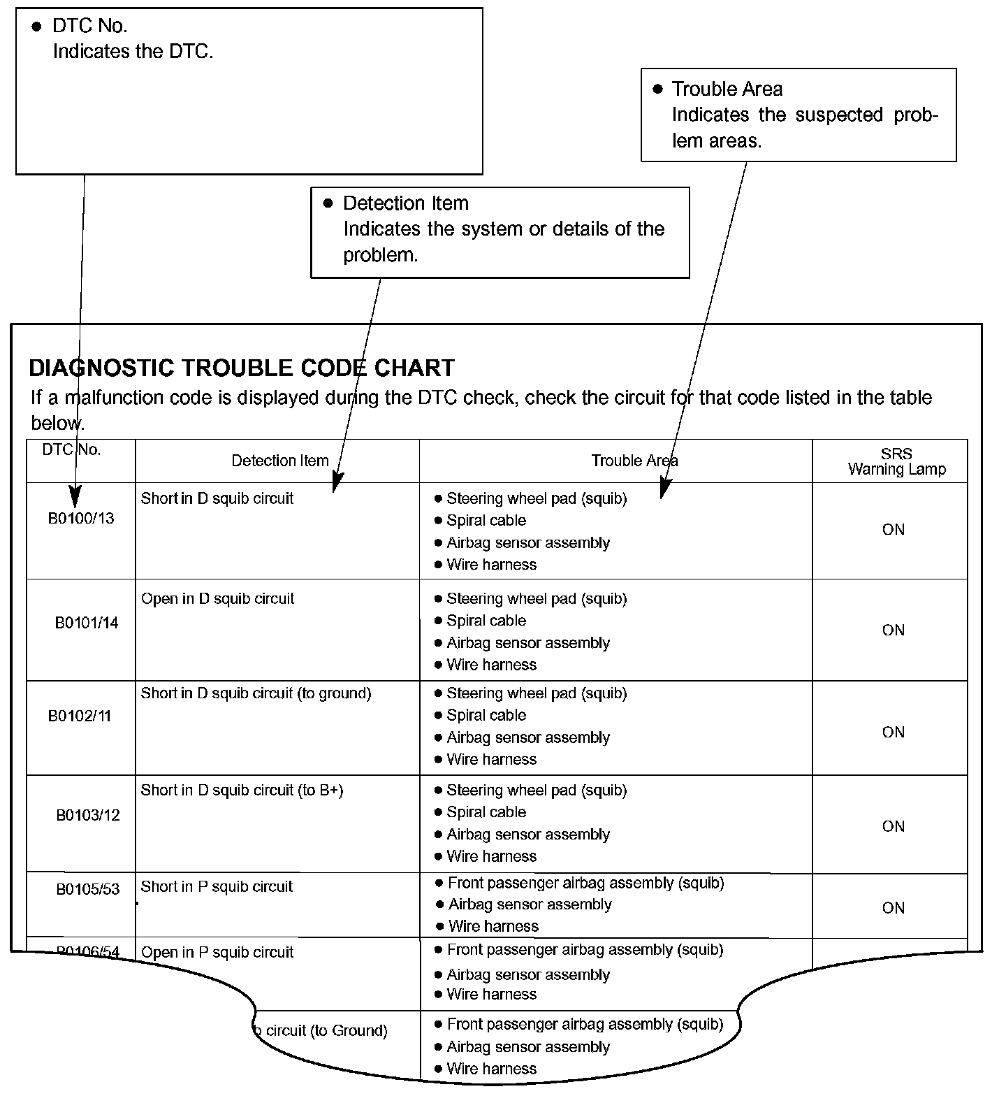 DIAGNOSTIC TROUBLE CODE CHARTUse Diagnostic Trouble Codes (DTCs) (from the DTC checks) in the table to determine the trouble area and proper inspection procedure. The Supplemental Restraint System (SRS) DTC chart is shown as an example.