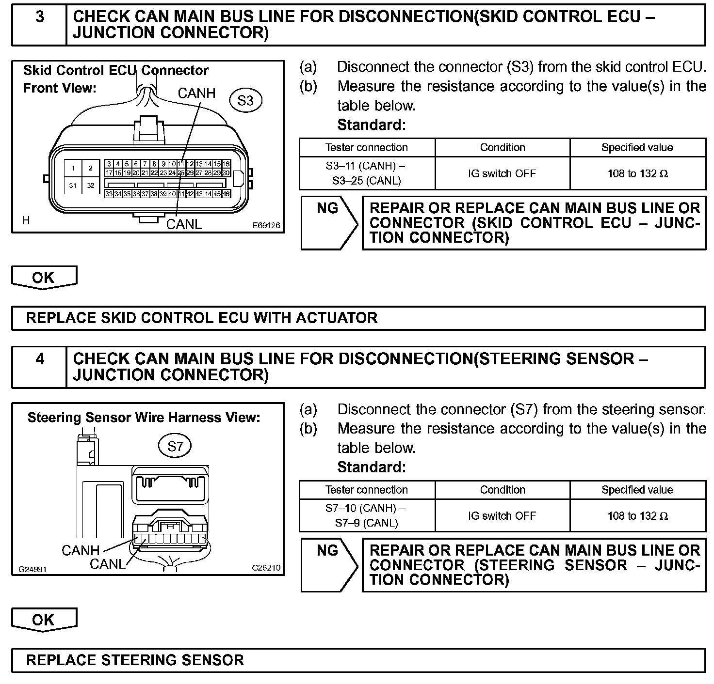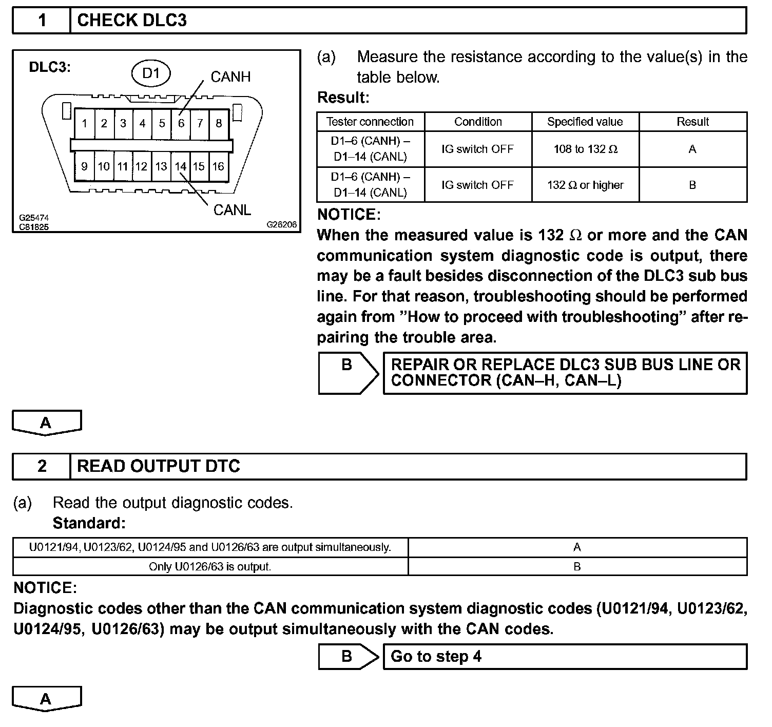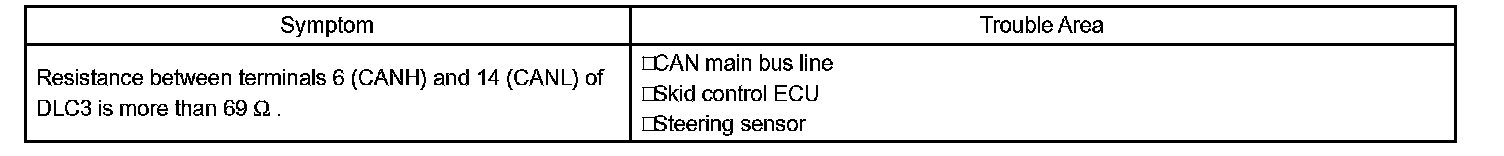The CAN main bus line and DLC3 sub bus line may have a disconnection when the resistance between terminals 6 (CANH) and 14 (CANL) of the DLC3 is more than 69 Ohms.