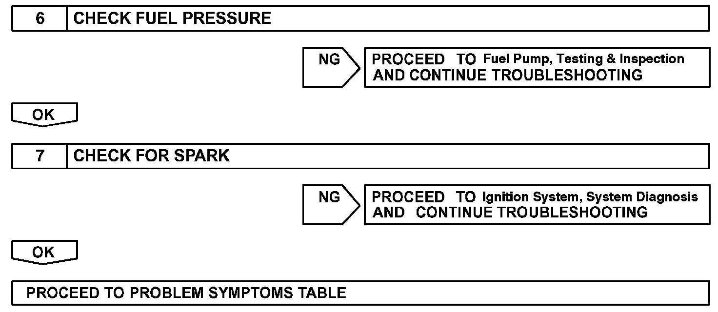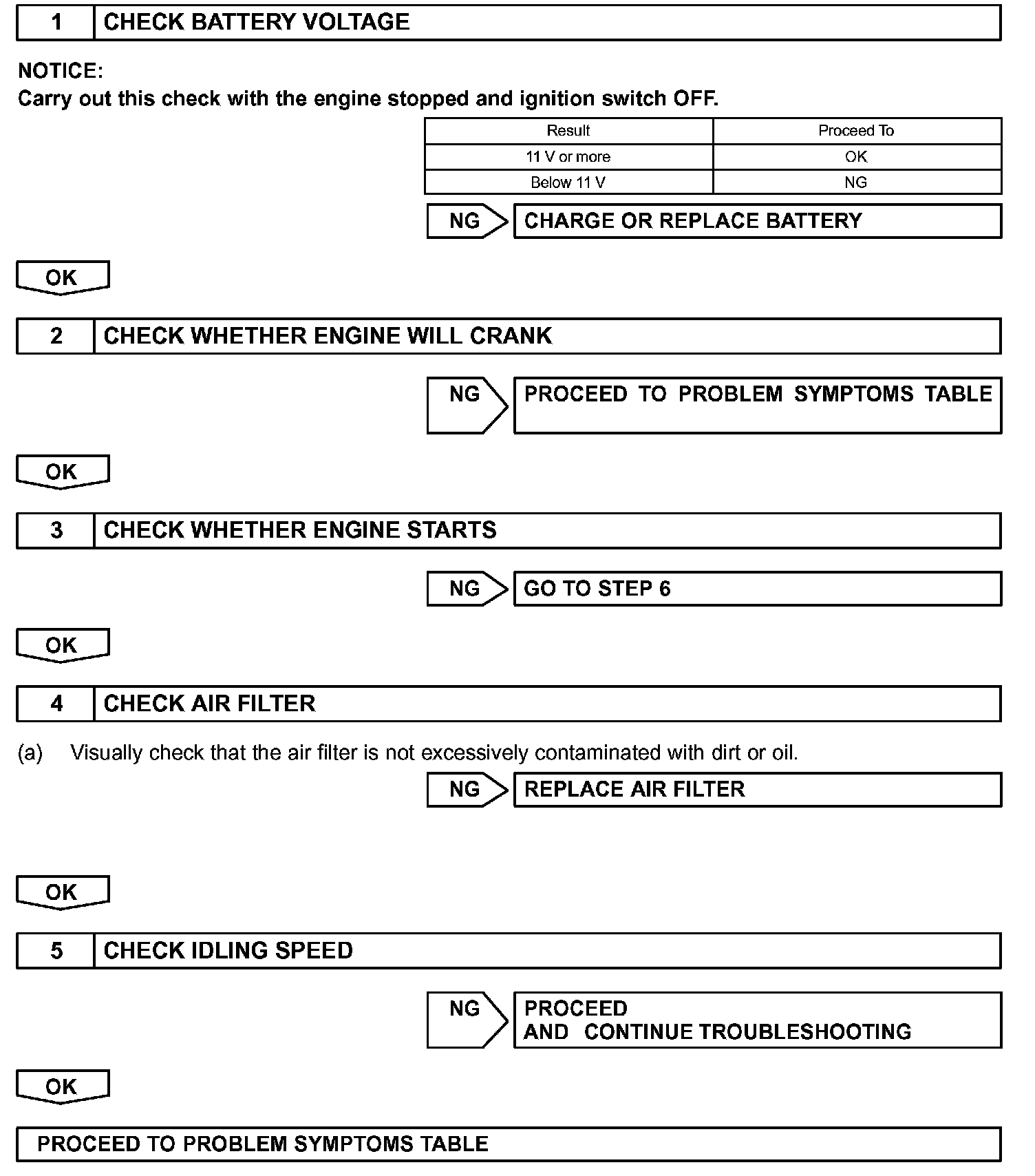 BASIC INSPECTIONWhen a malfunction is not confirmed by the DTC check, troubleshooting should be carried out in all circuits considered to be possible causes of the problem. In many cases, by carrying out the basic engine check shown in the following flowchart, the location of the problem can be found quickly and efficiently. Therefore, using this check is essential when engine troubleshooting.