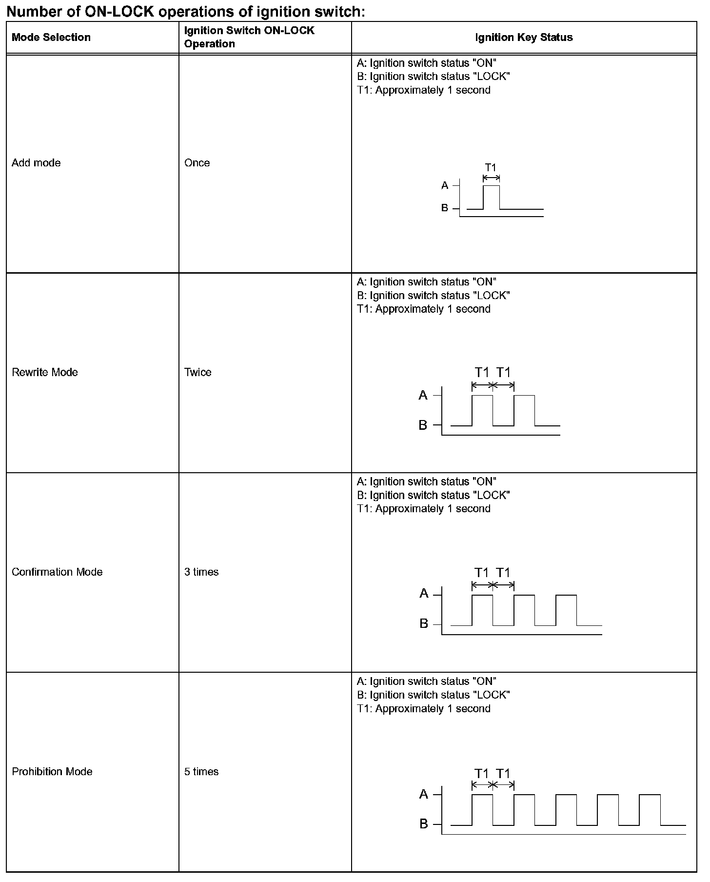 h. Turn the ignition switch from LOCK to ON and back to LOCK at approximately 1 second intervals according to the number of times shown in the table.
