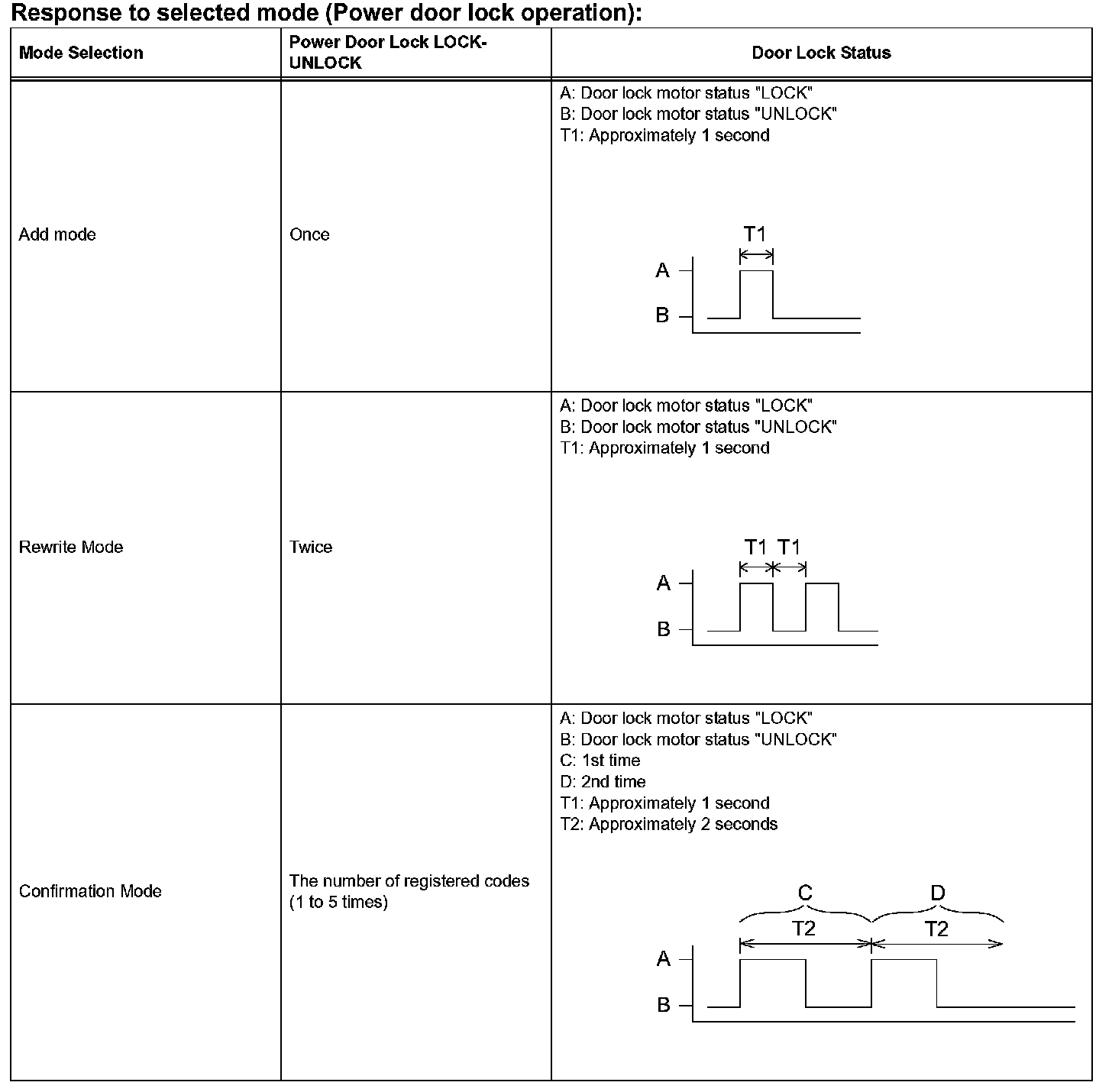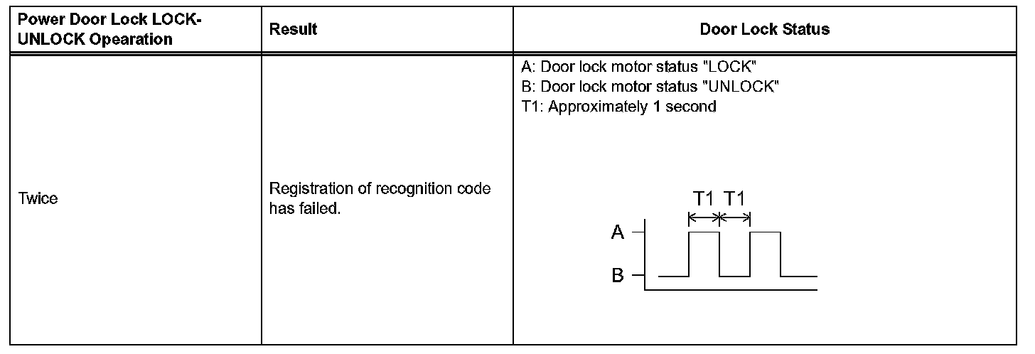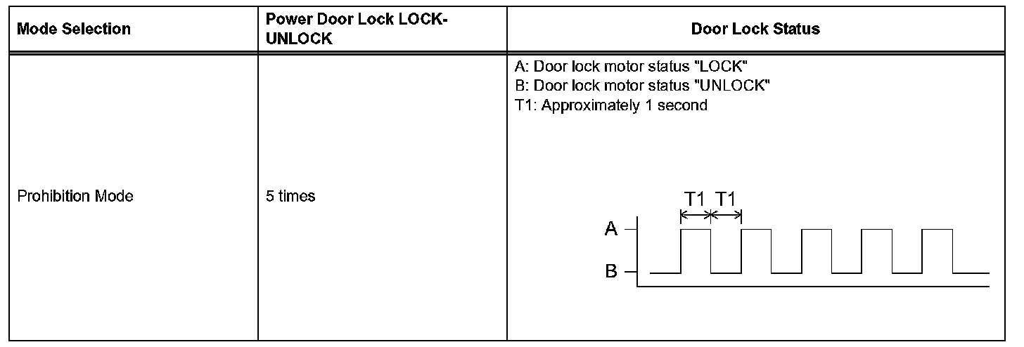 HINT: If the number of the ON-LOCK operations of the ignition switch is 0, 4 or 6 or more, there will be no response (power door LOCK-UNLOCK operation) to show which mode has been selected.