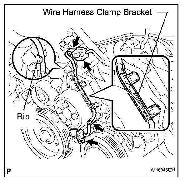 f. Confirm that the wire harness of the sensor is secured to the wire harness clamp bracket through the back of the rib of the timing chain cover.