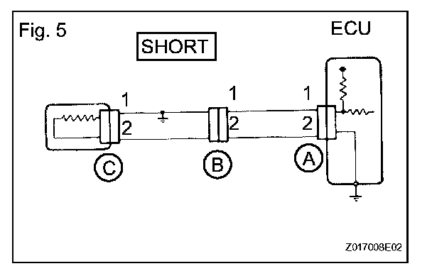 CHECK FOR SHORT CIRCUITa. If the wire harness is ground shorted (Fig. 5), locate the section by conducting a resistance check with the body ground.