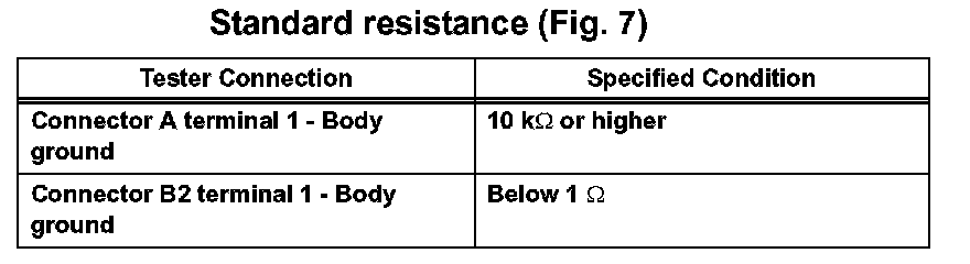 If the results match the examples above, a short circuit exists between terminal 1 of connector B2 and terminal 1 of connector C.