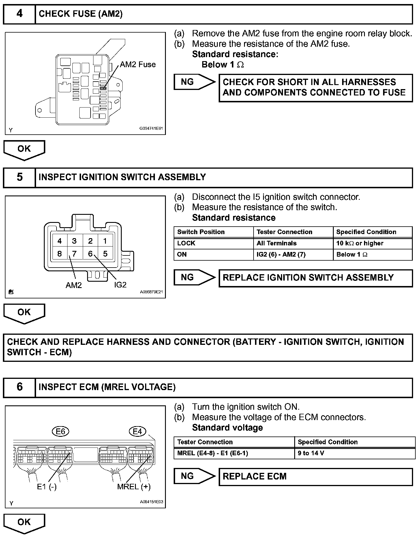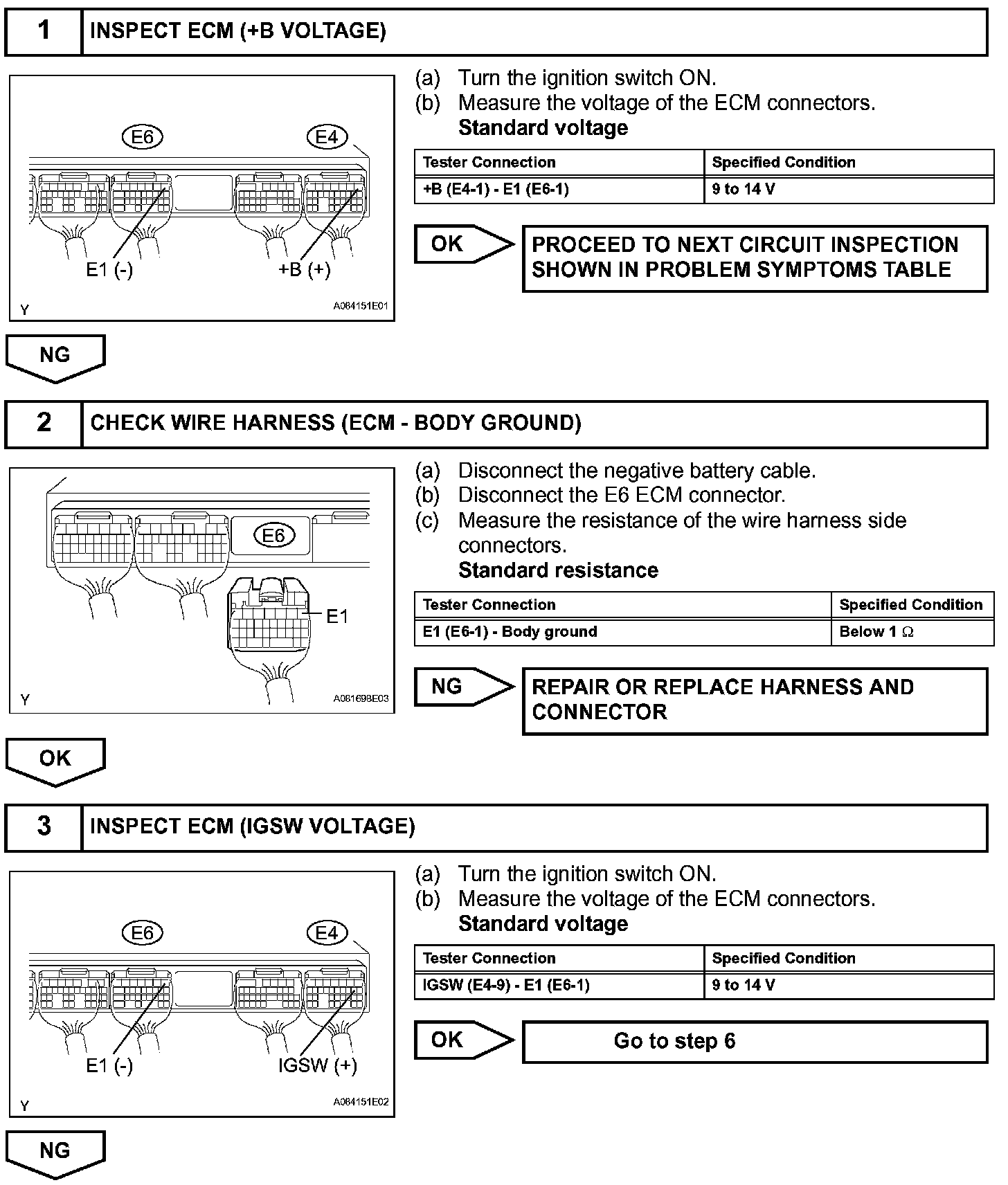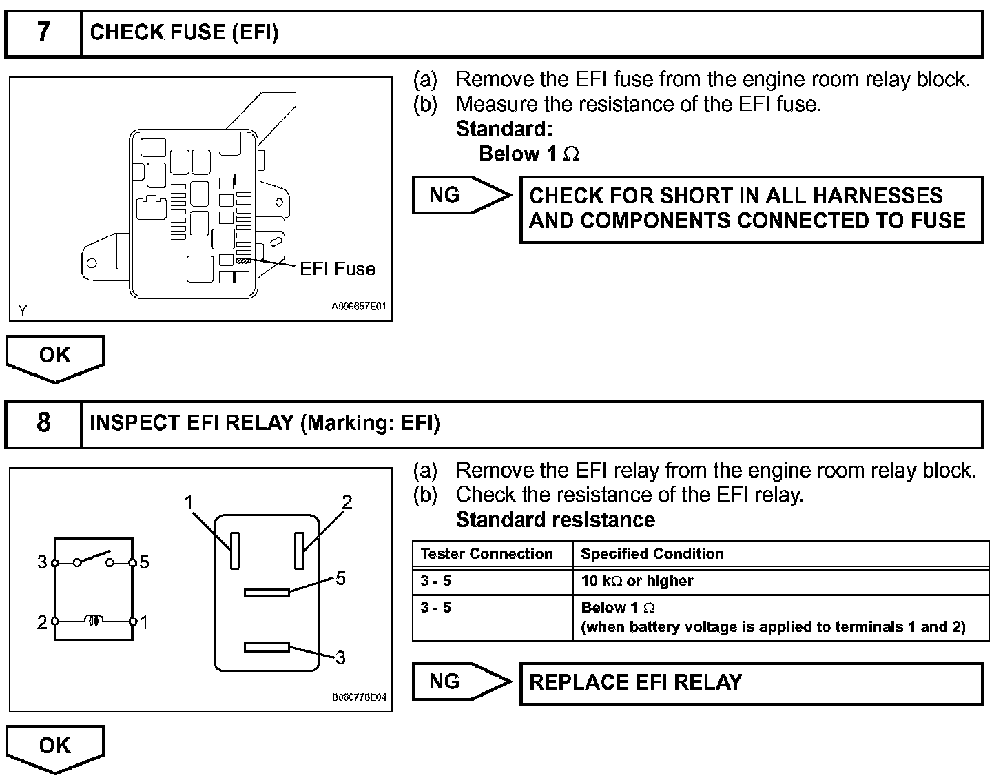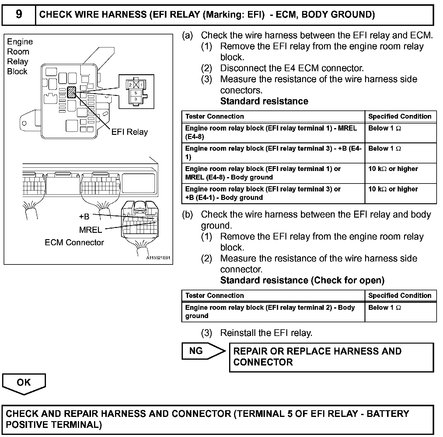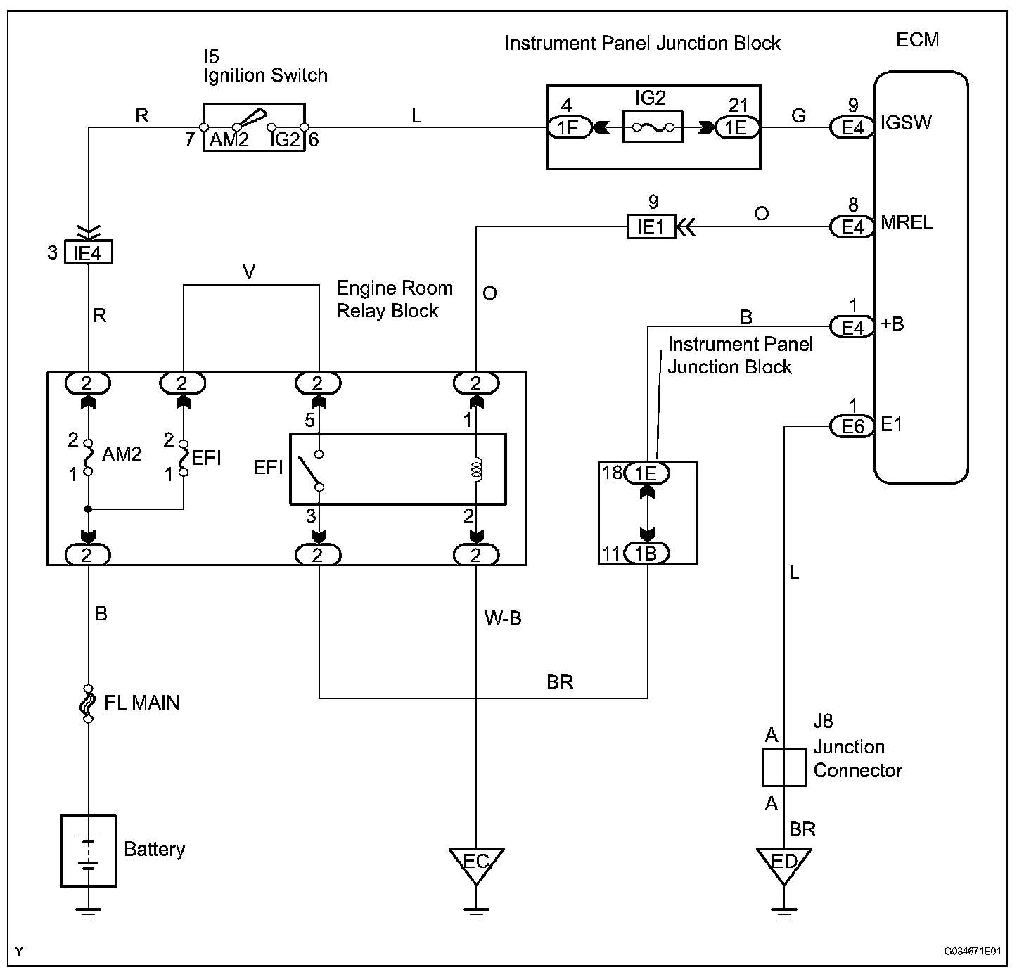 When the ignition switch is turned ON, the battery voltage is applied to terminal IGSW of the ECM. The ECM MREL output signal causes a current to flow to the coil, closing the contacts of the EFI relay and supplying power to terminal +B of the ECM.