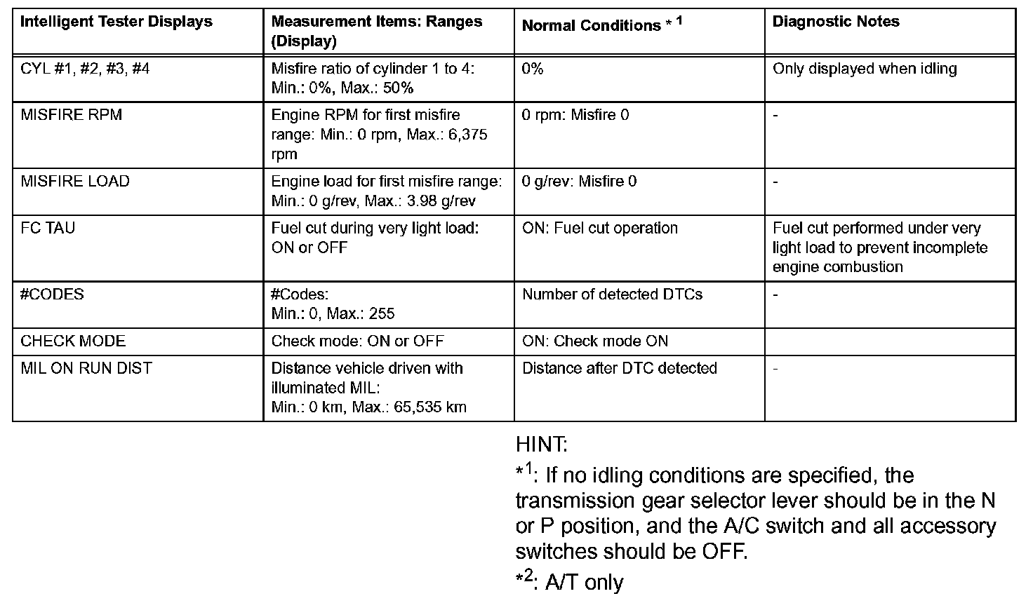DATA LISTHINT: By reading the DATA LIST displayed on the intelligent tester or OBD II scan tool, you can check values, including those of the switches, sensors, and actuators, without removing any parts. Reading the DATA LIST as the first step of troubleshooting is one method of shortening diagnostic time.