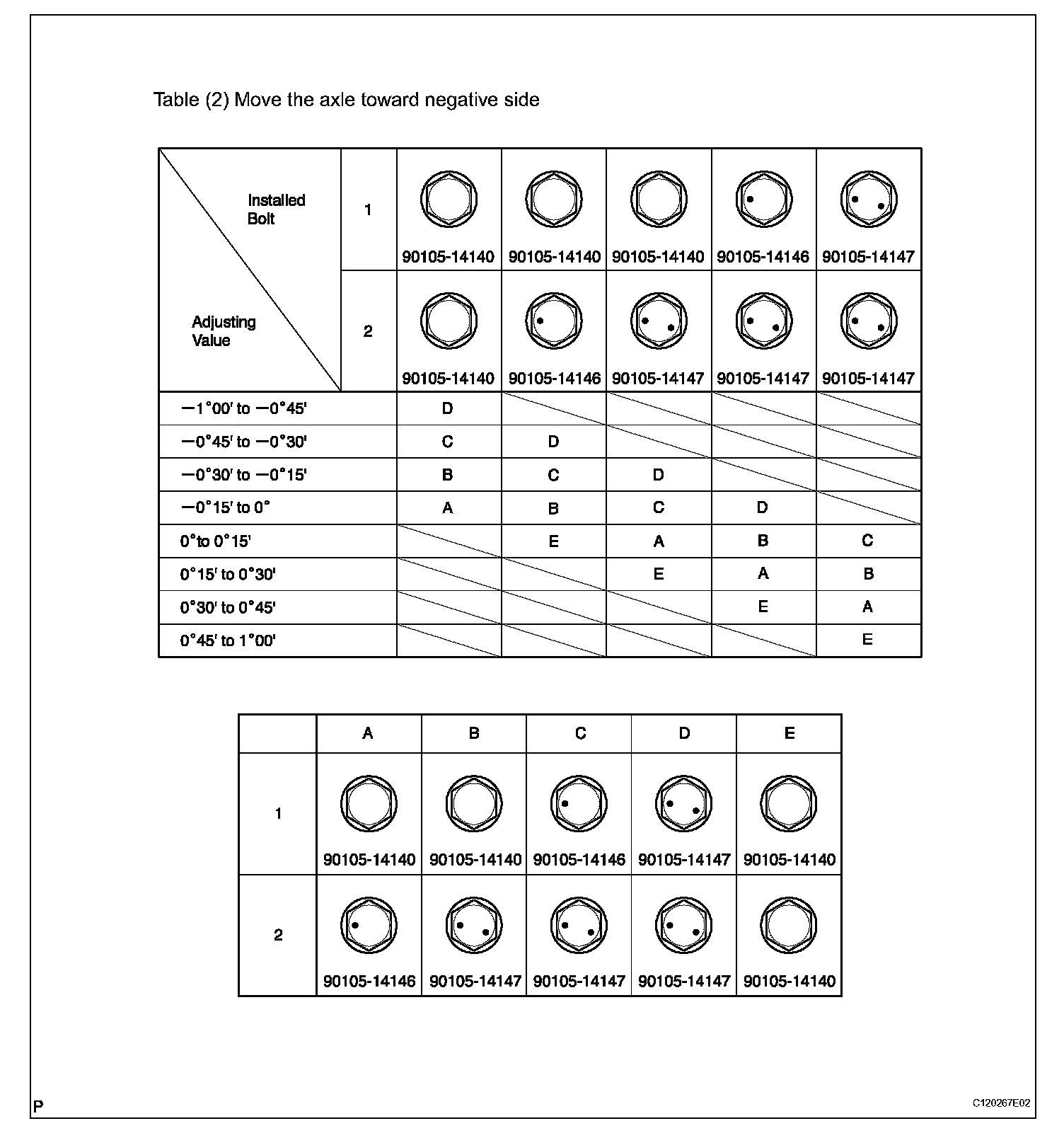Check installed bolts combination. Select appropriate bolts from the table to adjust the camber to within the specified range.