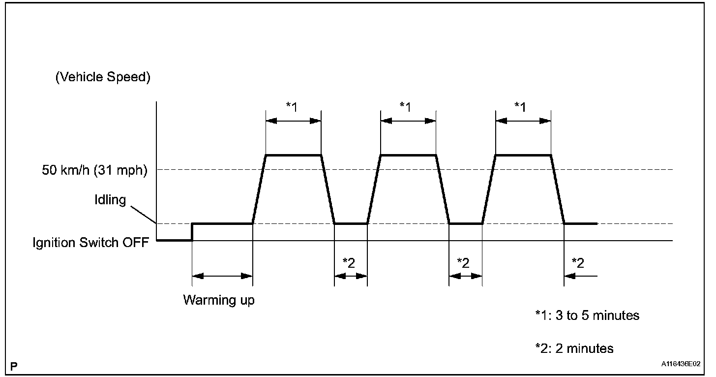 6. Drive the vehicle at 50 km/h (31 mph) or more for 3 to 5 minutes*1.