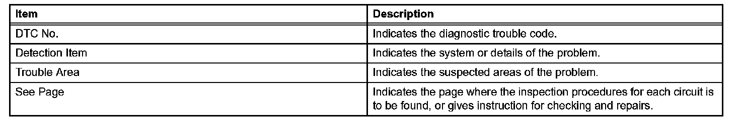 DIAGNOSTIC TROUBLE CODE CHARTLook for output Diagnostic Trouble Codes (DTCs) (from the DTC checks) in the appropriate section's Diagnostic Trouble Code Chart. Use the chart to determine the trouble area and the proper inspection procedure. A description of each of the chart's columns are as mentioned.