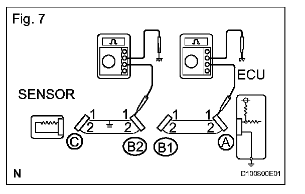 If the results match the examples above, a short circuit exists between terminal 1 of connector B2 and terminal 1 of connector C.