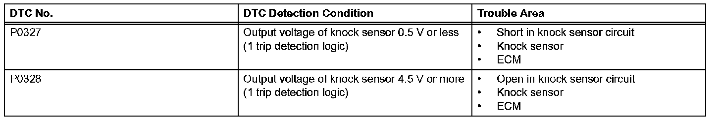 HINT: When any of DTCs P0327 and P0328 are set, the ECM enters fail-safe mode. During fail-safe mode, the ignition timing is delayed to its maximum retardation. Fail-safe mode continues until the ignition switch is turned OFF.