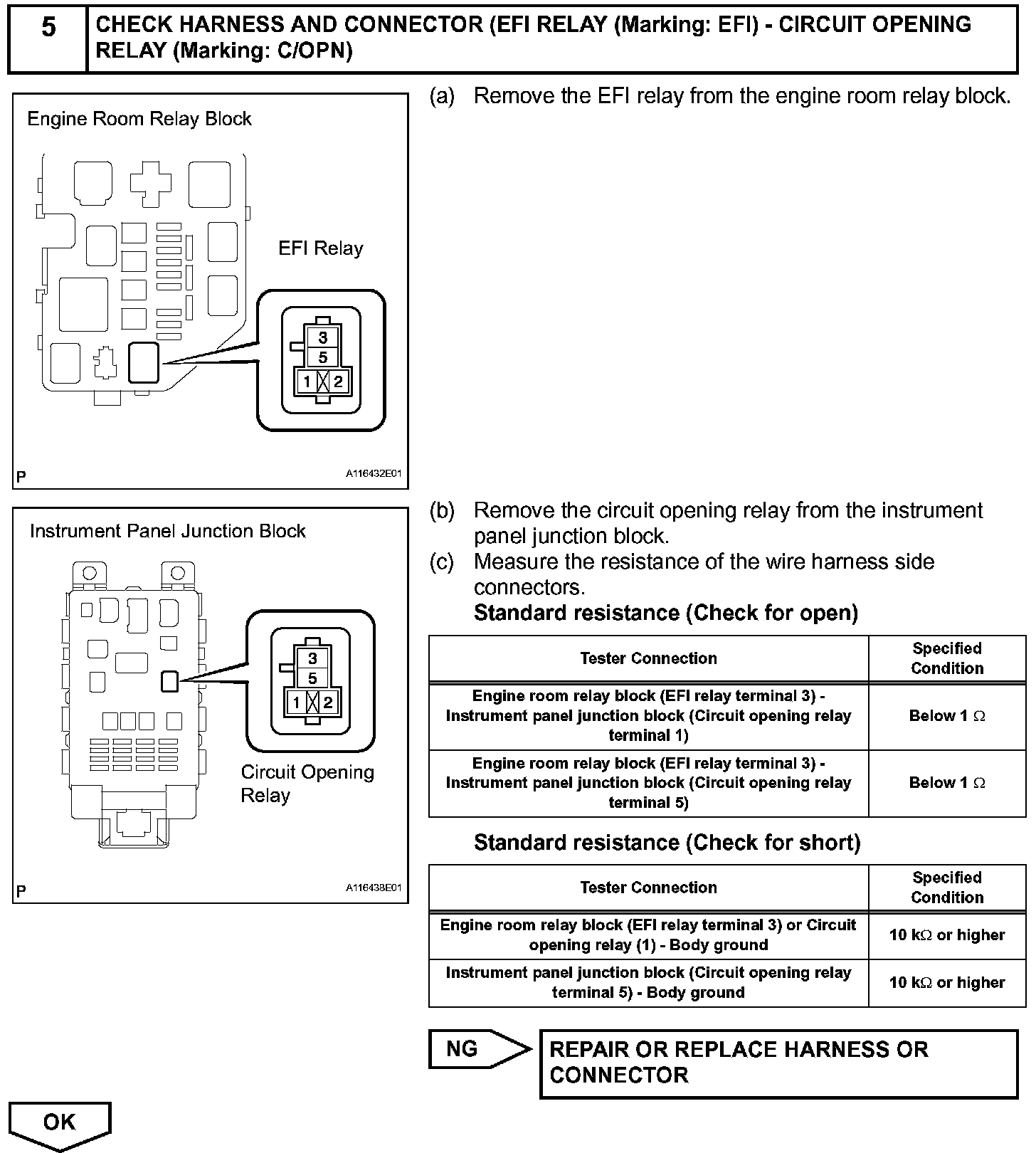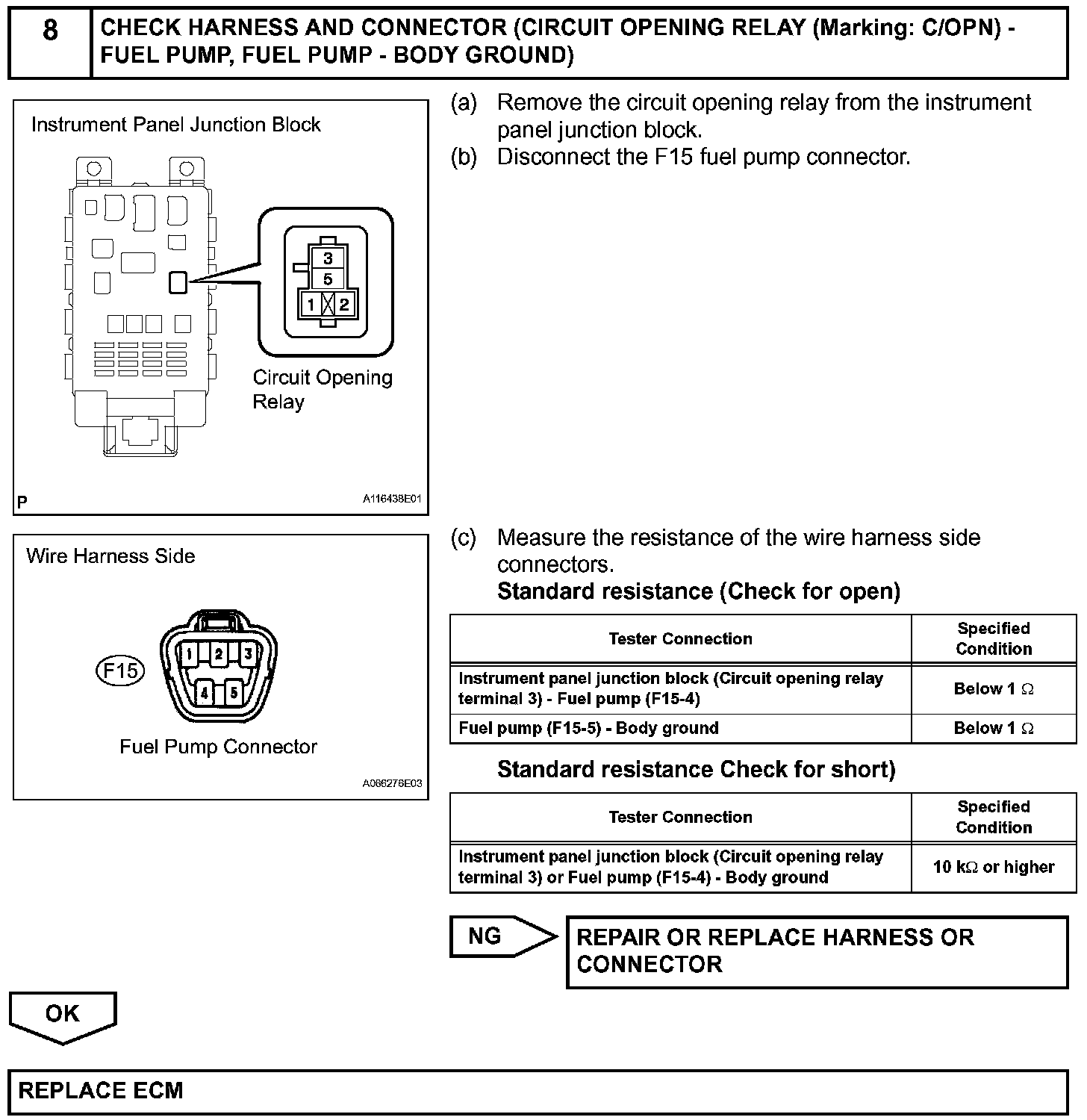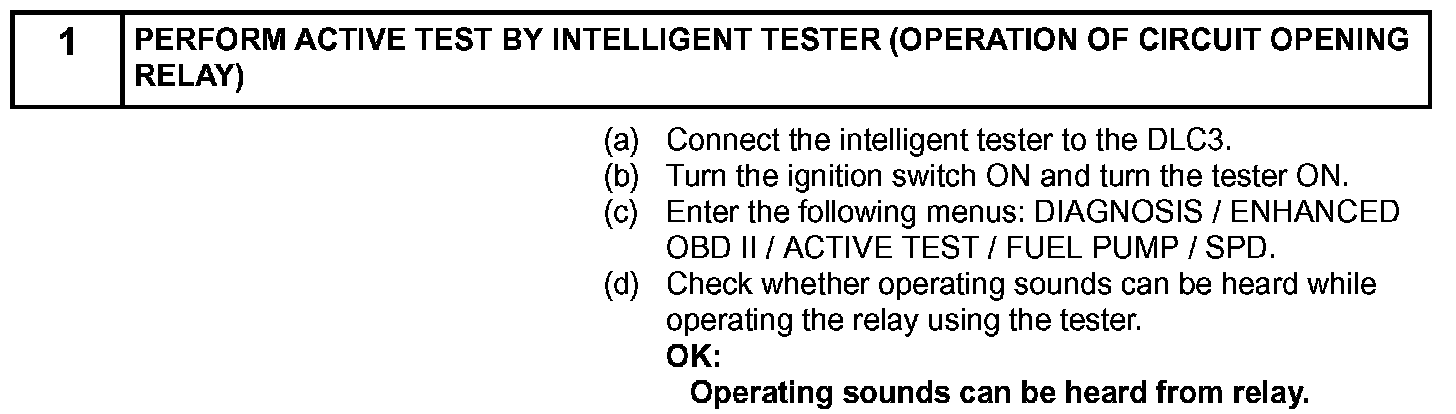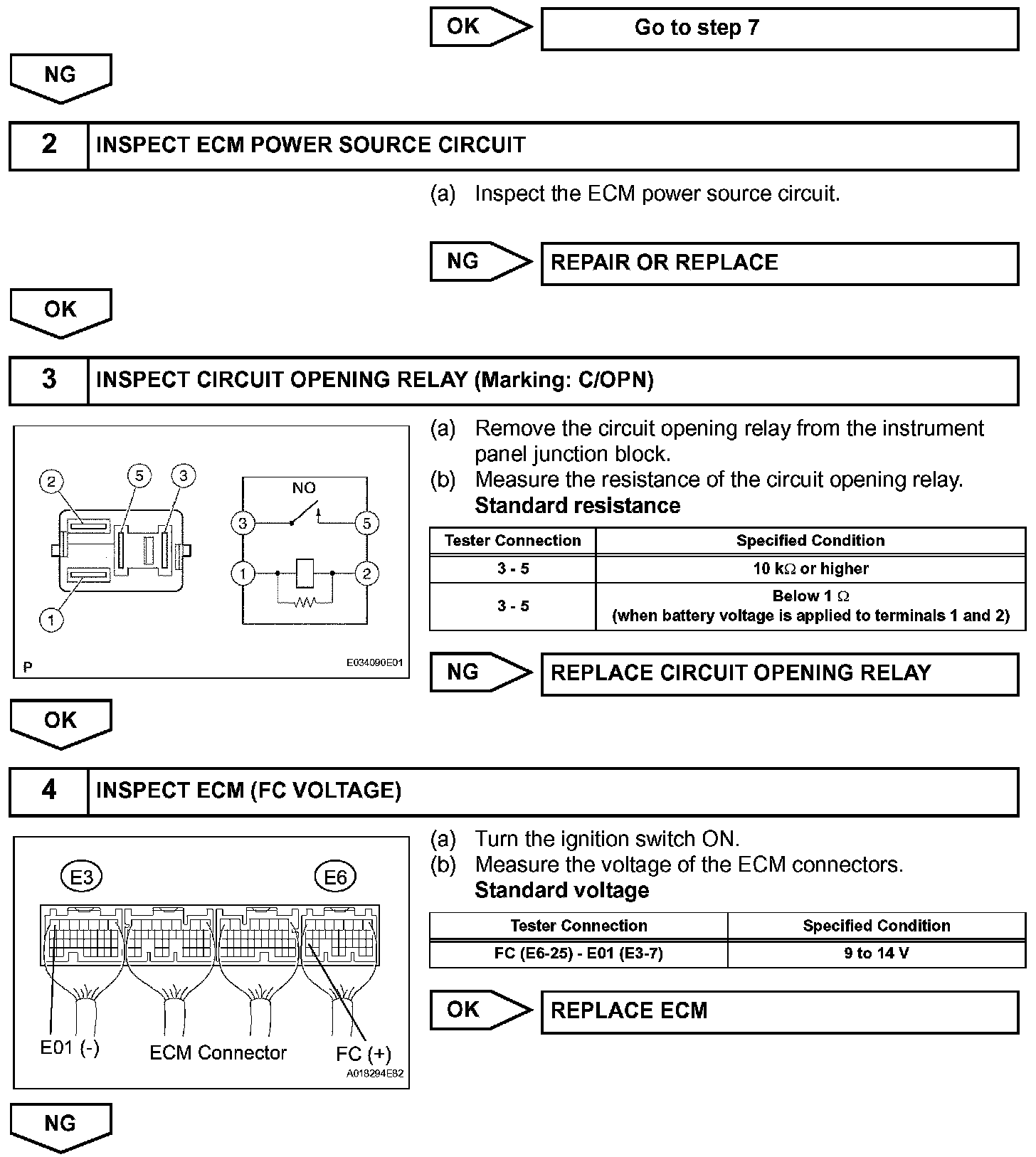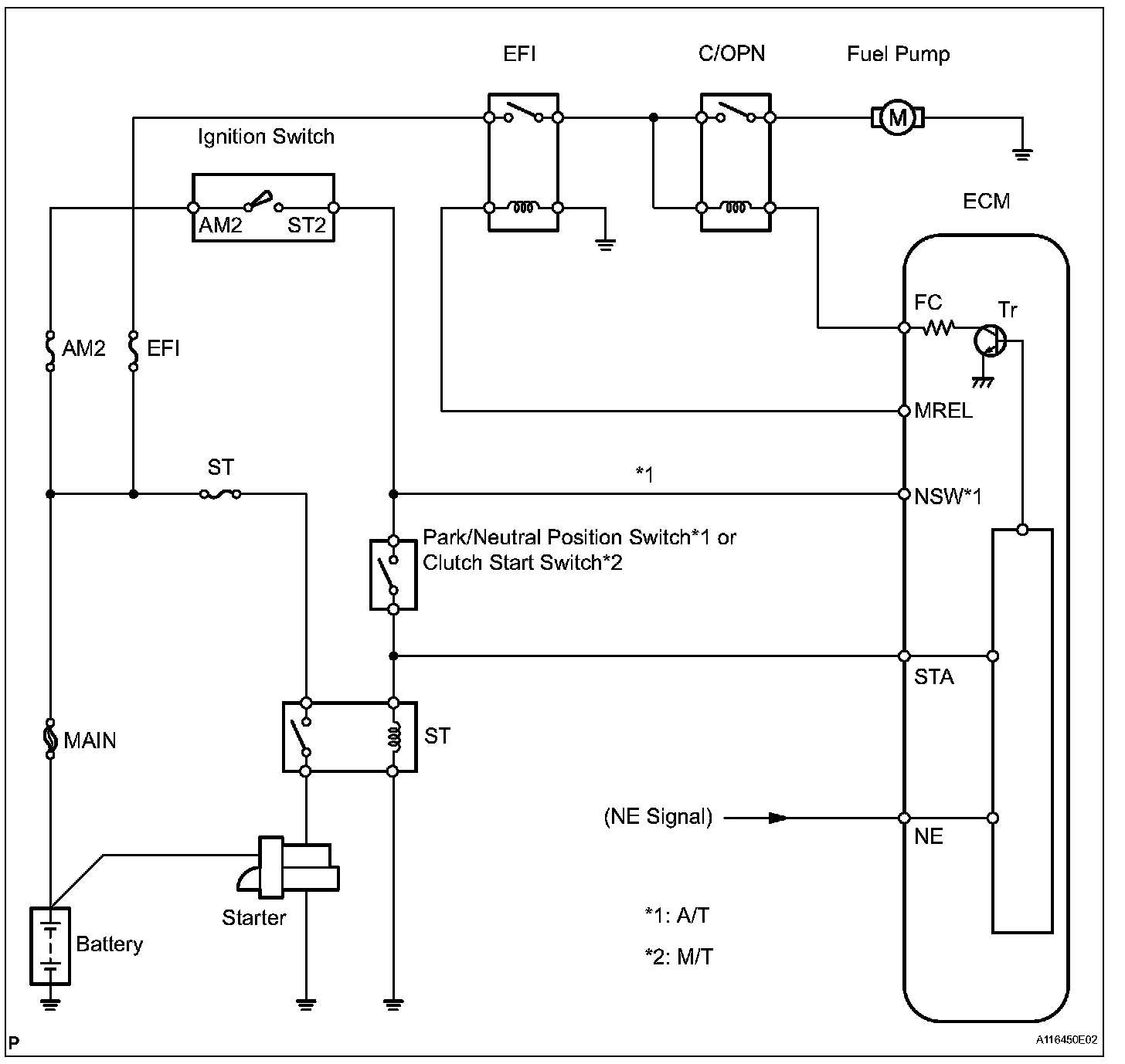When the STA and NE signals are received by the ECM, Tr (power transistor) is switched on, allowing a current to flow into the circuit opening relay (Marking: C/OPN) coil, the circuit opening relay switches on, power is supplied to the fuel pump and the fuel pump operates.
