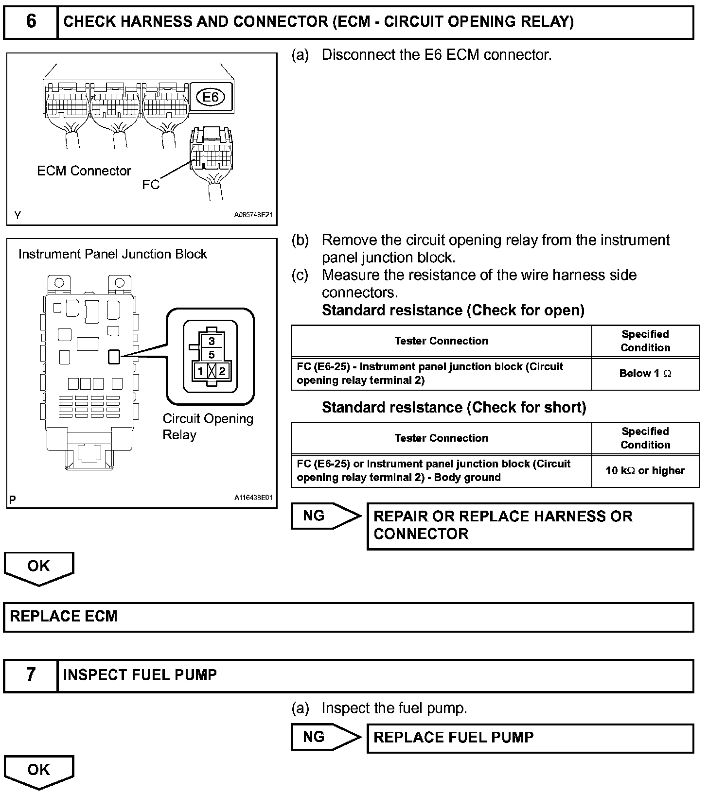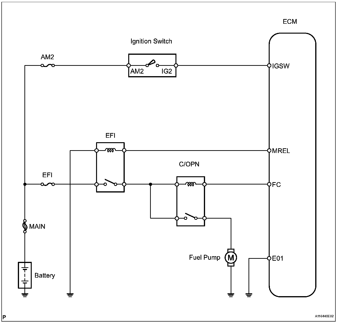 While the NE signal is being generated (engine running), the ECM keeps Tr ON, therefore keeping the circuit opening relay ON, so that the fuel pump continues to operate.
