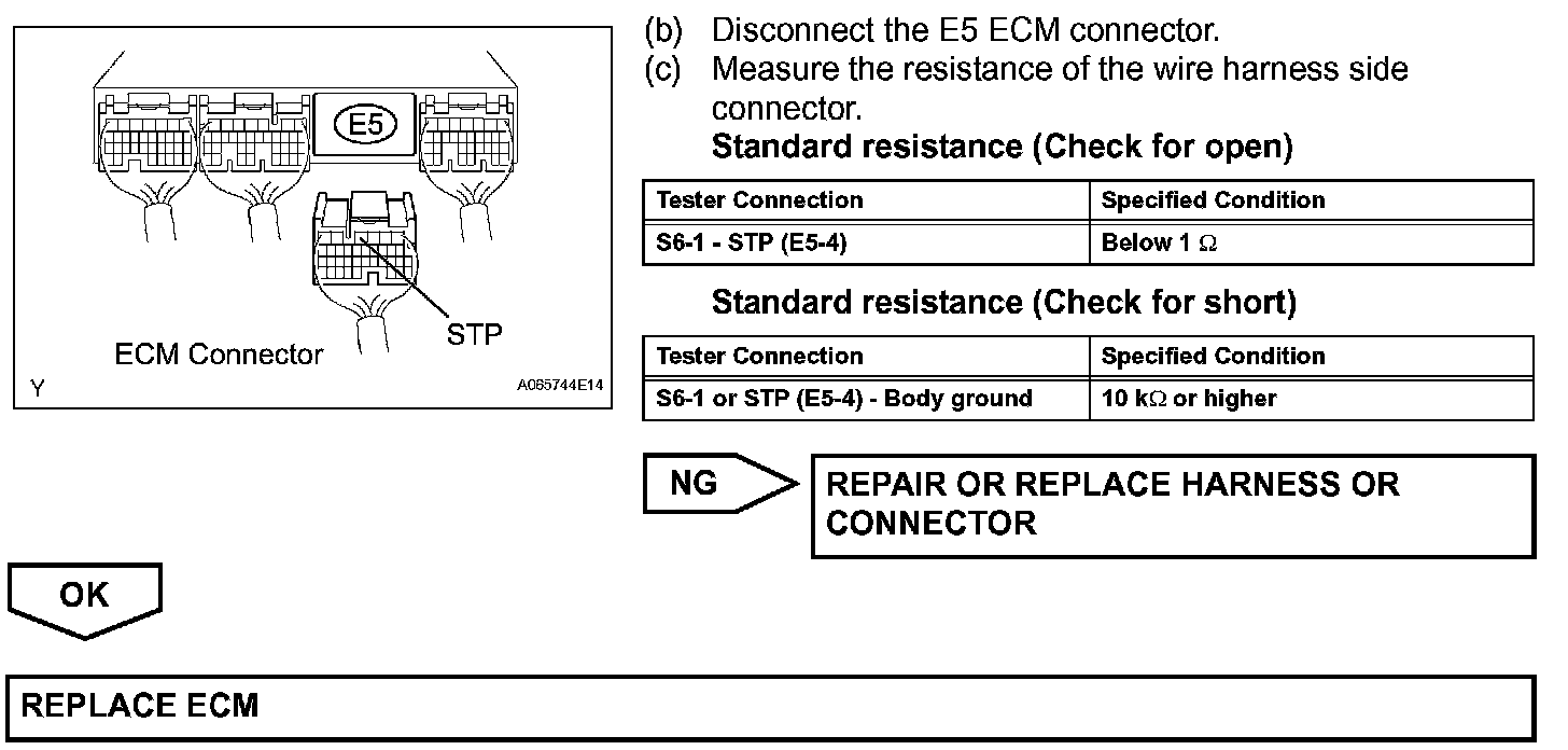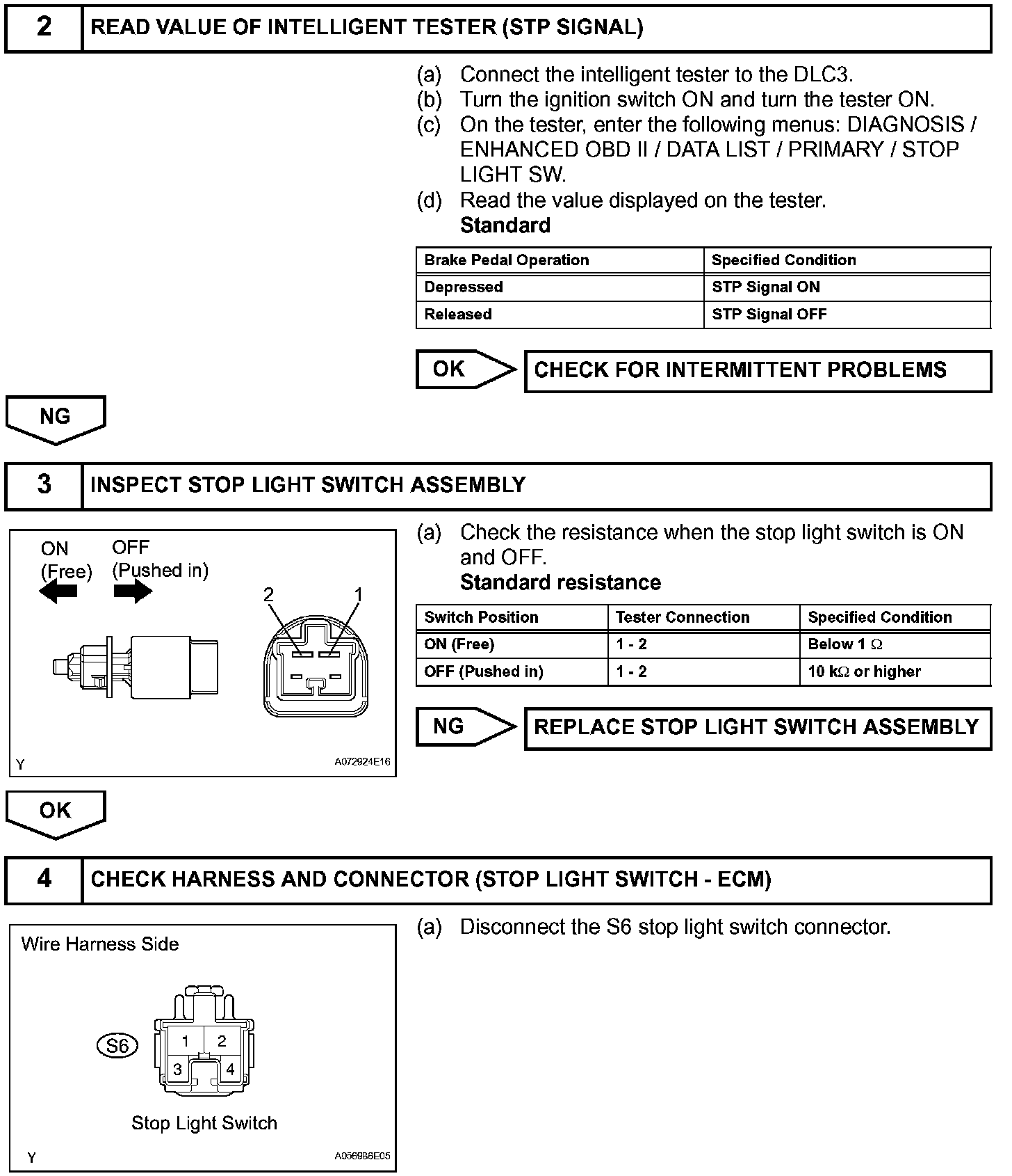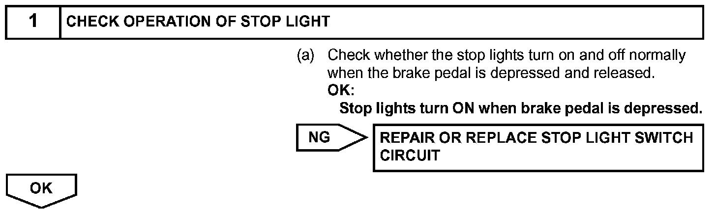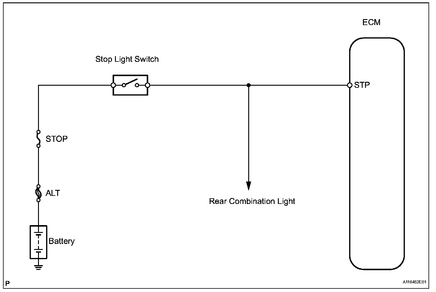 When the brake pedal is depressed, the stop light switch turns on and transmits an STP signal to the ECM. Upon receipt of the STP signal, the ECM determines that the brakes have been applied. The signal voltage level is the same as that of the voltage which is applied to the stop lights. In addition, the STP signal is used to control the fuel cut-off engine speed. Therefore, the fuel cut-off engine speed is slightly reduced when the vehicle is braking.