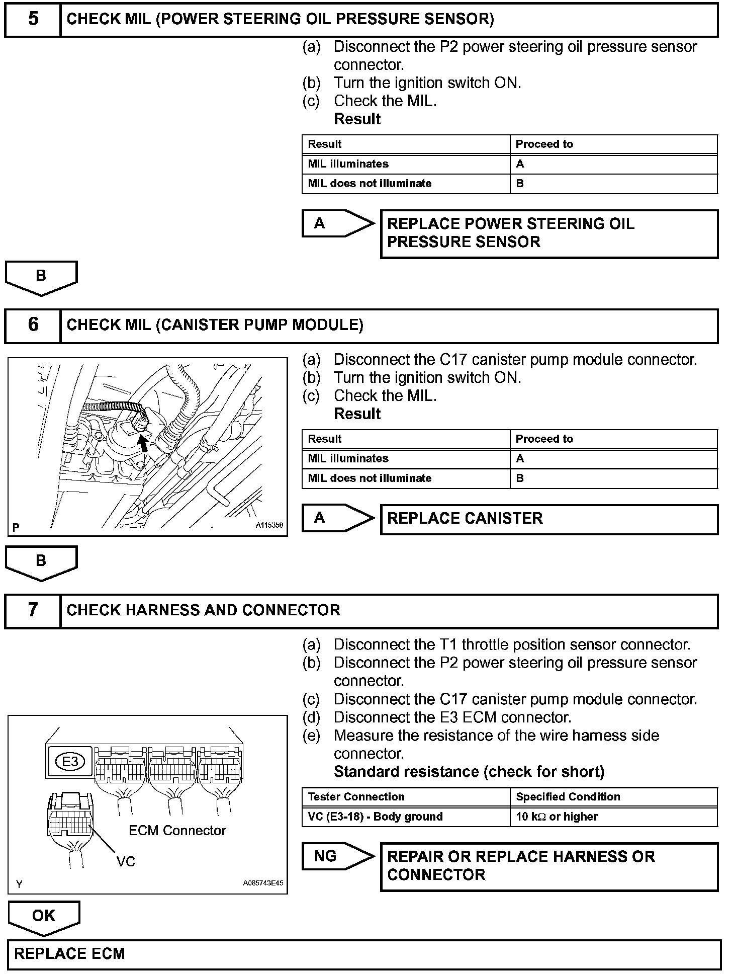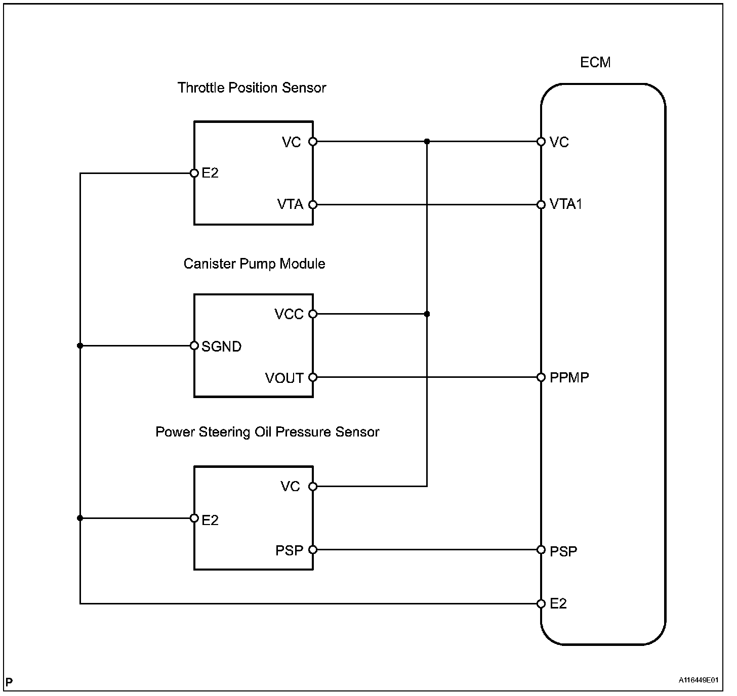 The VC voltage (5 V) is generated in the ECM. The voltage is used to supply power to the throttle position sensor, canister pump module, etc.