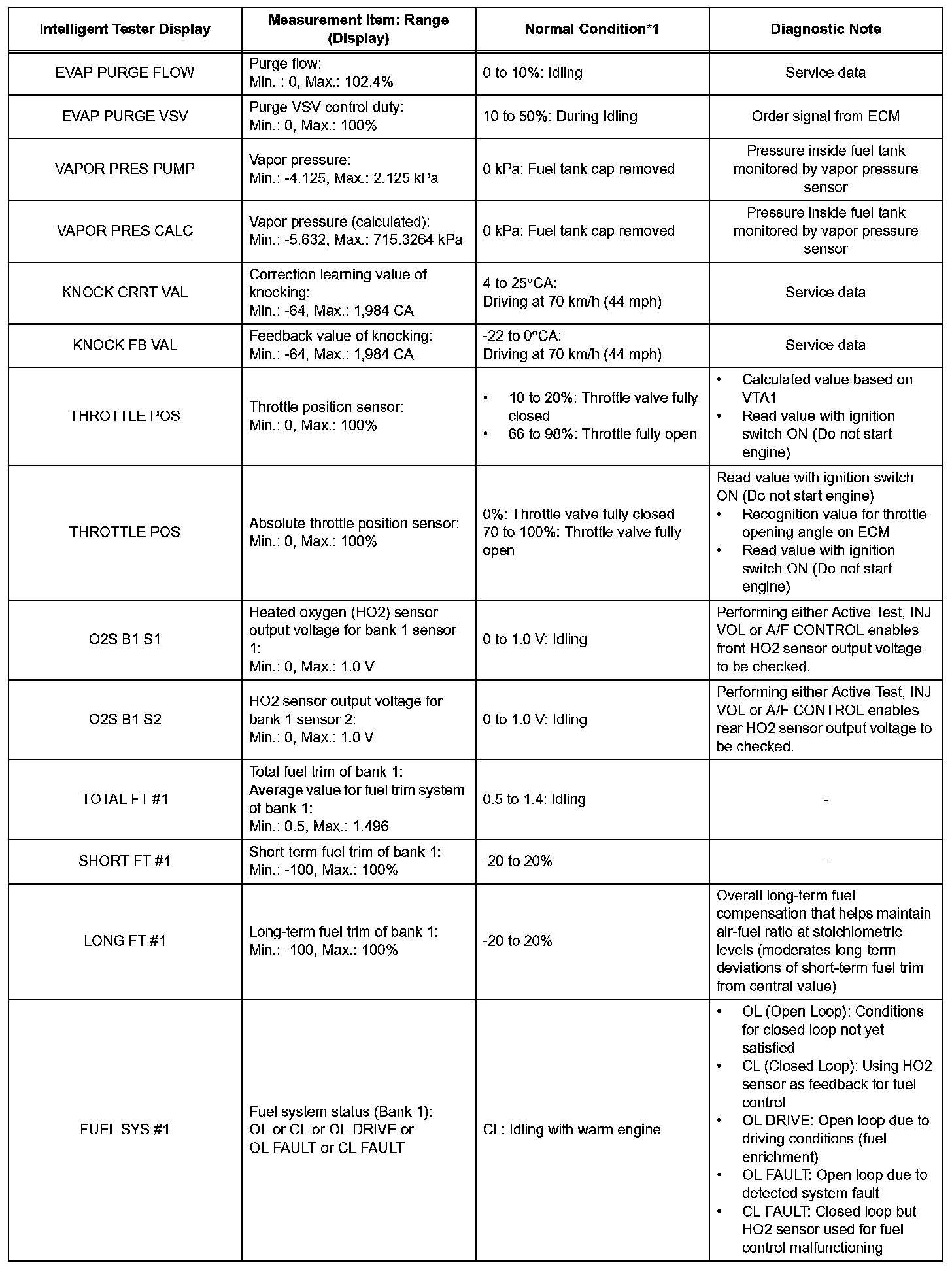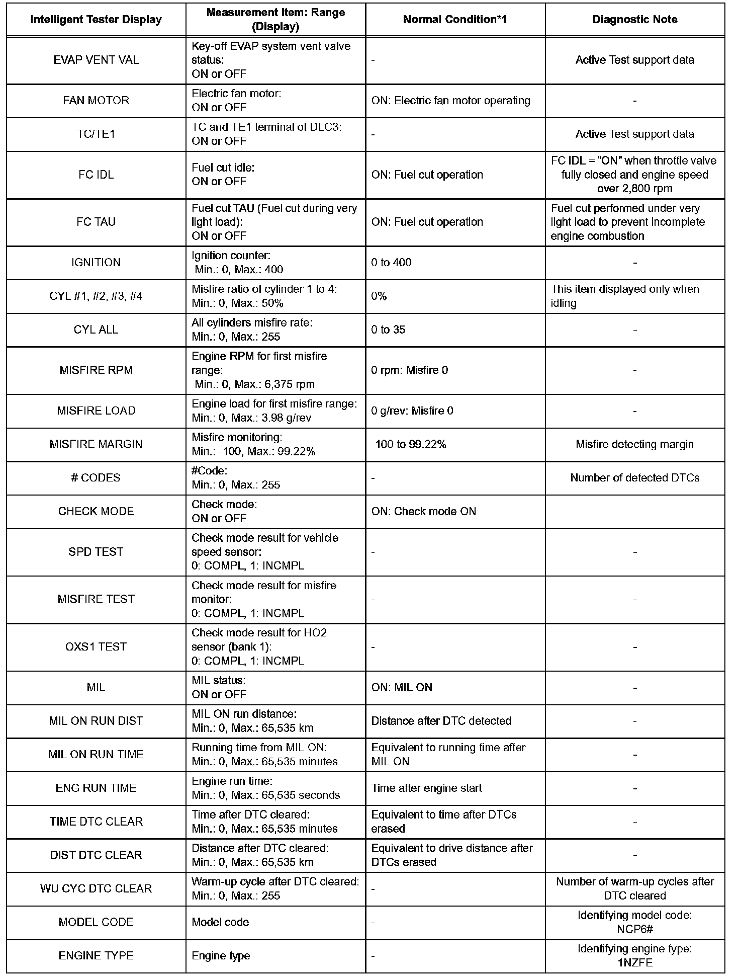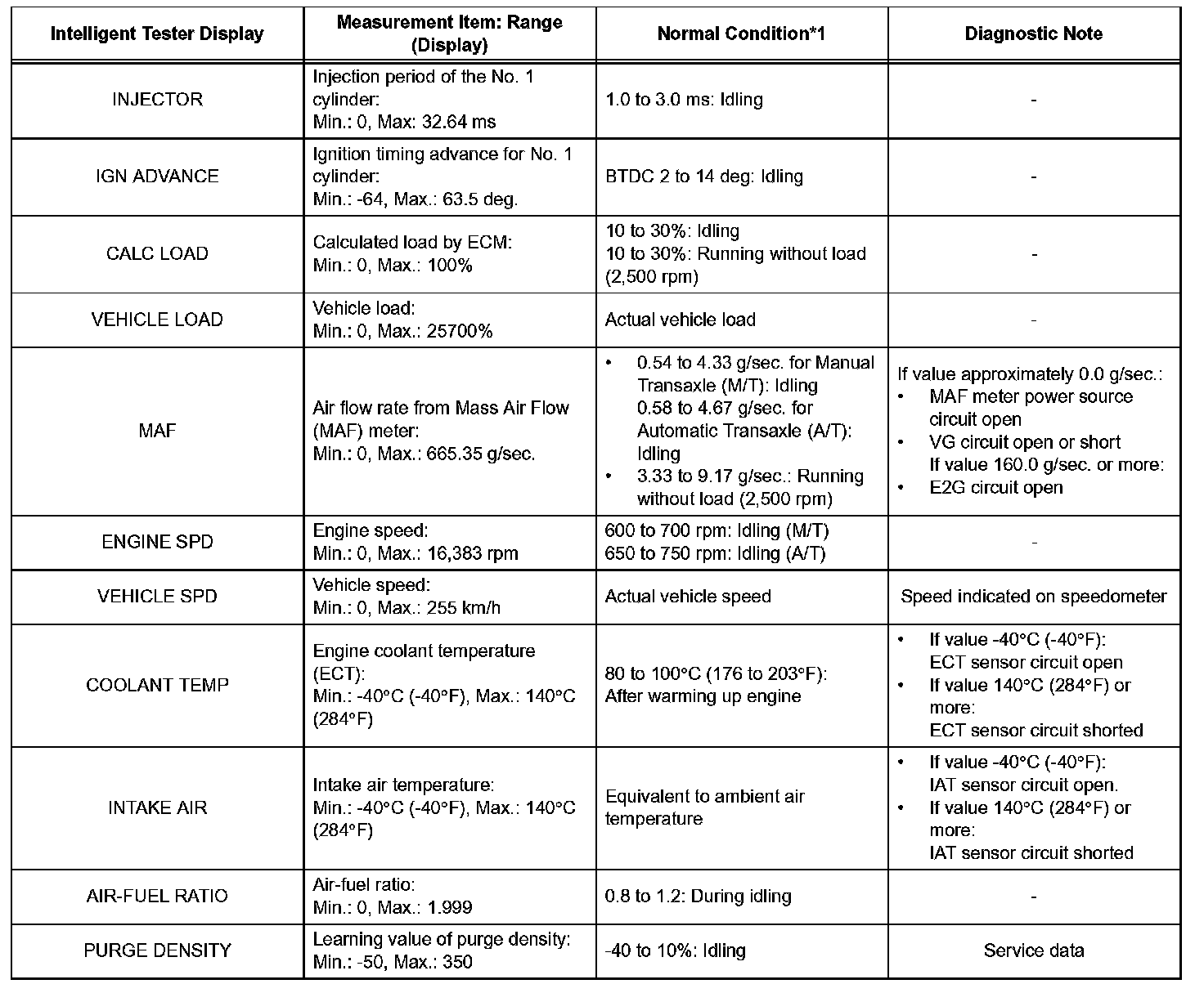 NOTE: In the table given, the values listed under "Normal Condition" are reference values. Do not depend solely on these reference values when deciding whether a part is faulty or not.