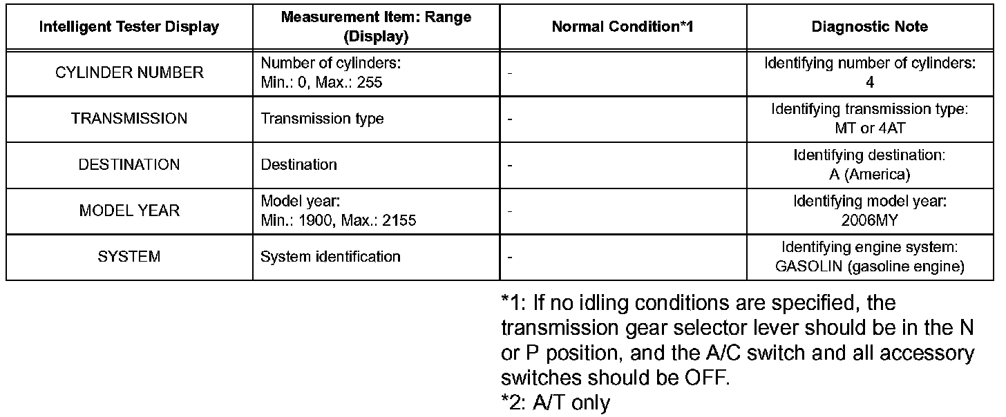 DATA LISTHINT: Using the intelligent tester's DATA LIST allows switch, sensor, actuator and other item values to be read without removing any parts. Reading the DATA LIST early in troubleshooting is one way to save time.