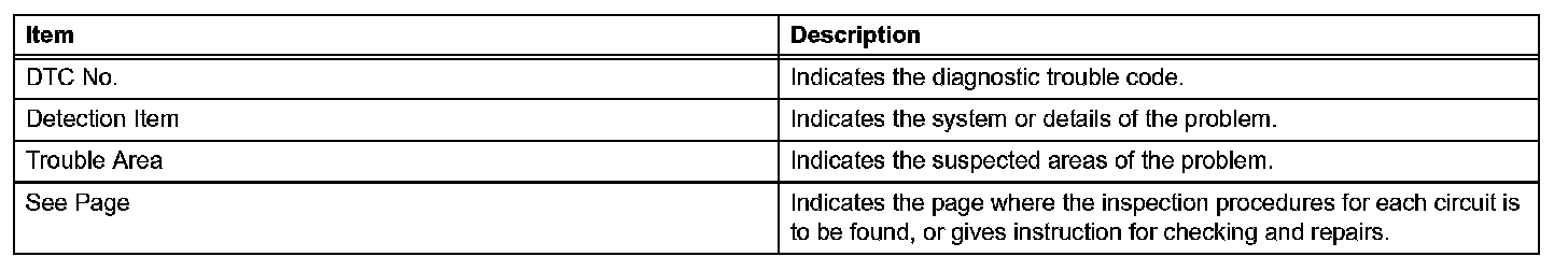 Look for output Diagnostic Trouble Codes (DTCs) (from the DTC checks) in the appropriate section's Diagnostic Trouble Code Chart. Use the chart to determine the trouble area and the proper inspection procedure. A description of each of the chart's columns is as given.