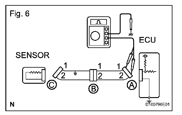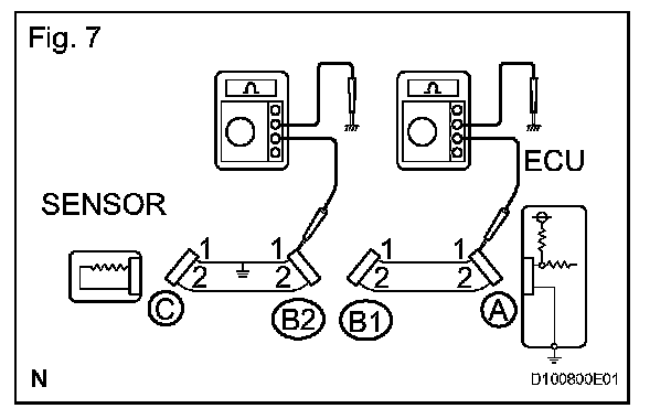 HINT: Measure the resistance while lightly shaking the wire harness vertically and horizontally. If the results match the examples above, a short circuit exists between terminal 1 of connector A and terminal 1 of connector C.