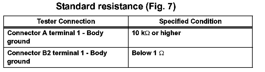 If the results match the examples above, a short circuit exists between terminal 1 of connector B2 and terminal 1 of connector C.