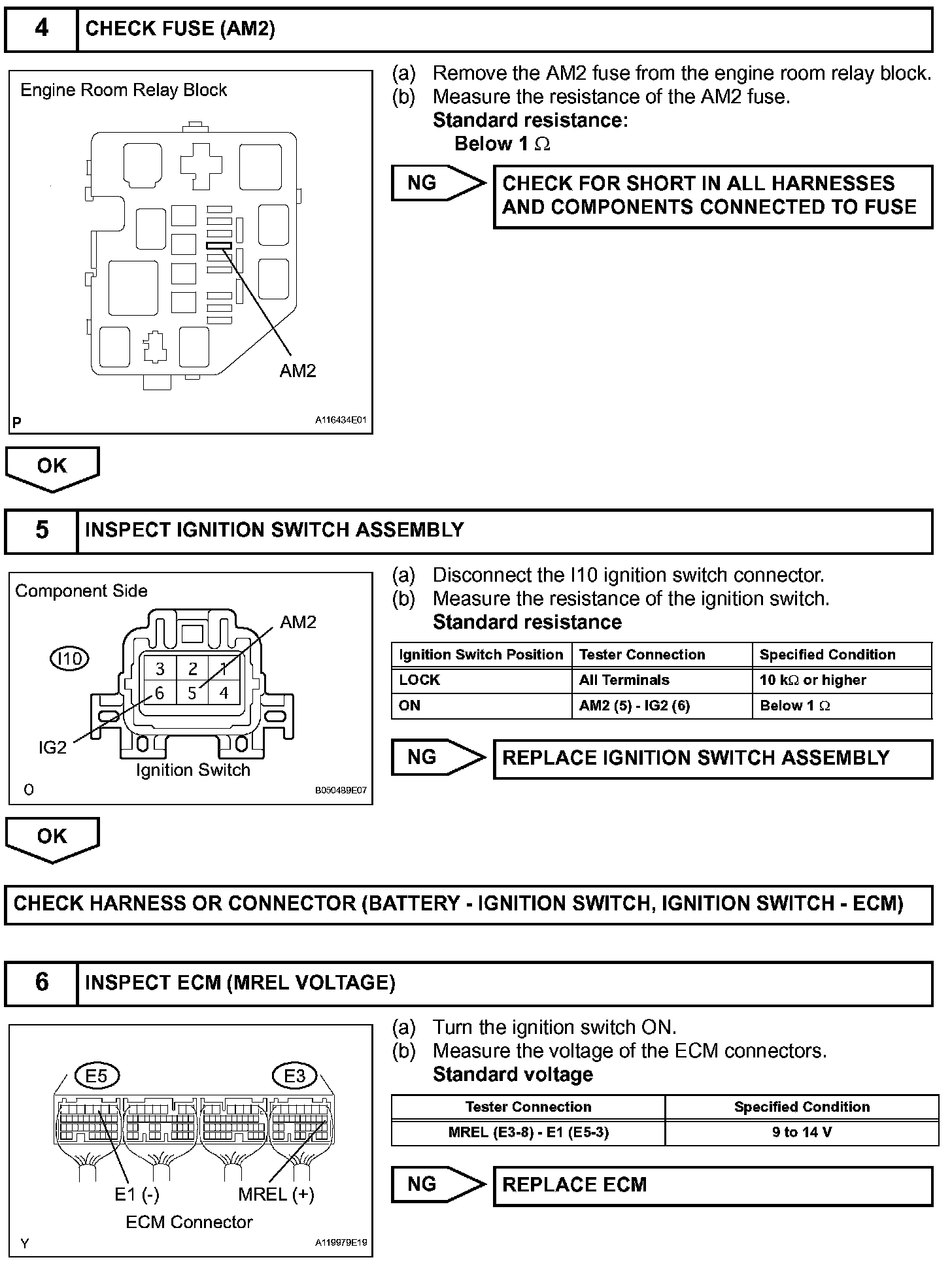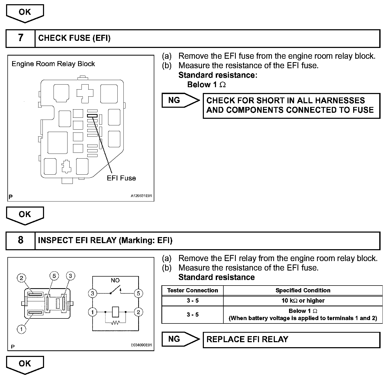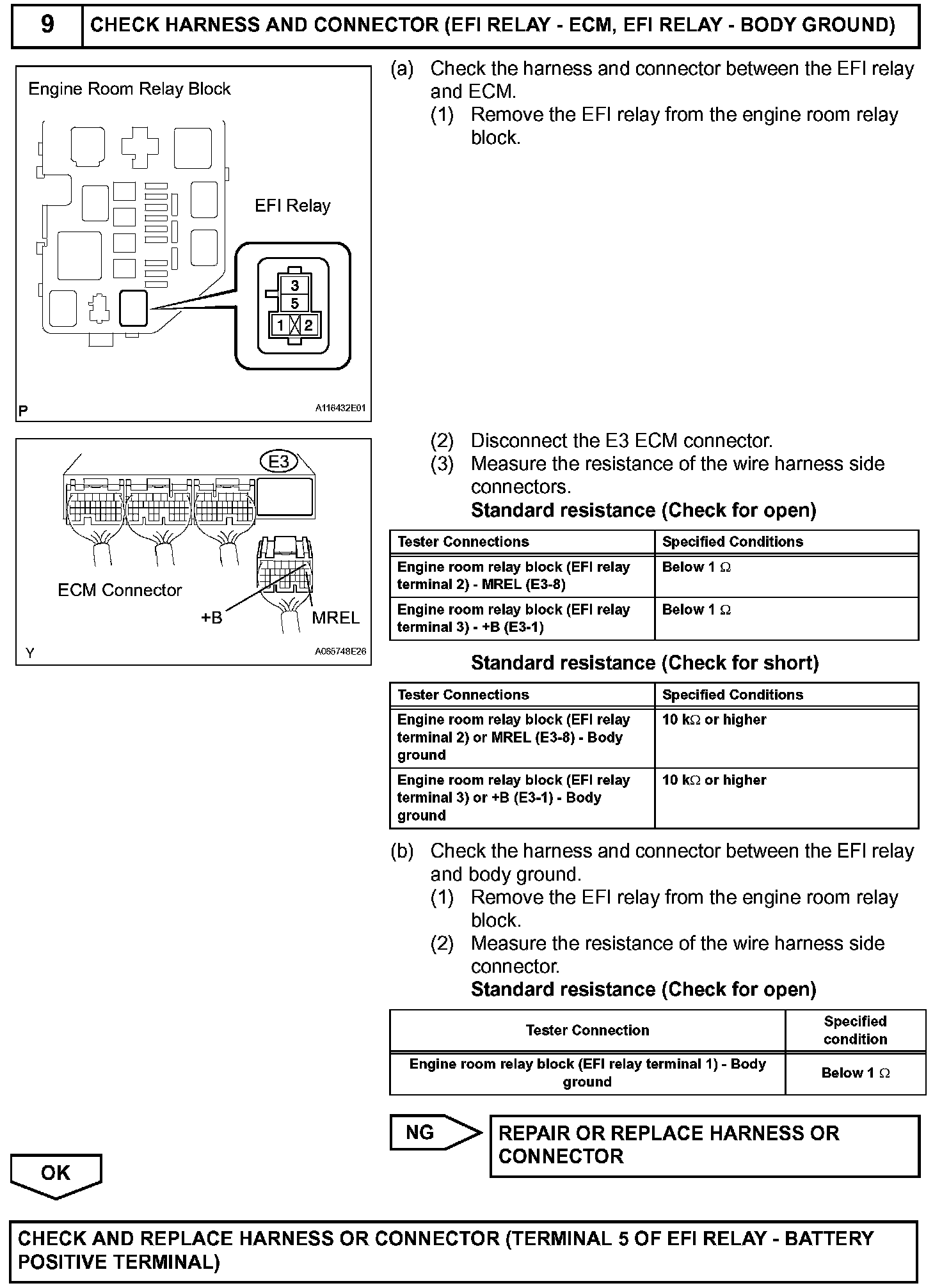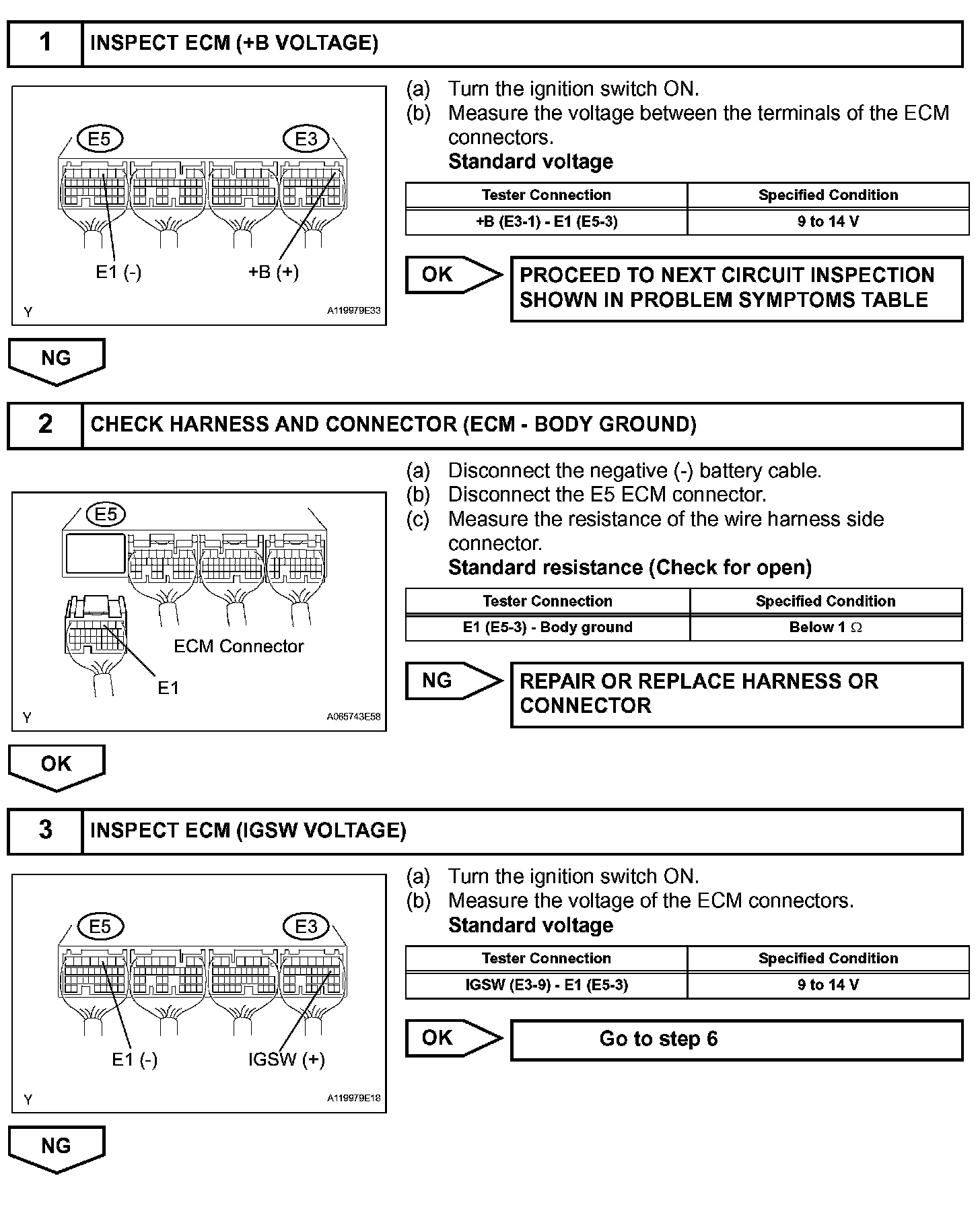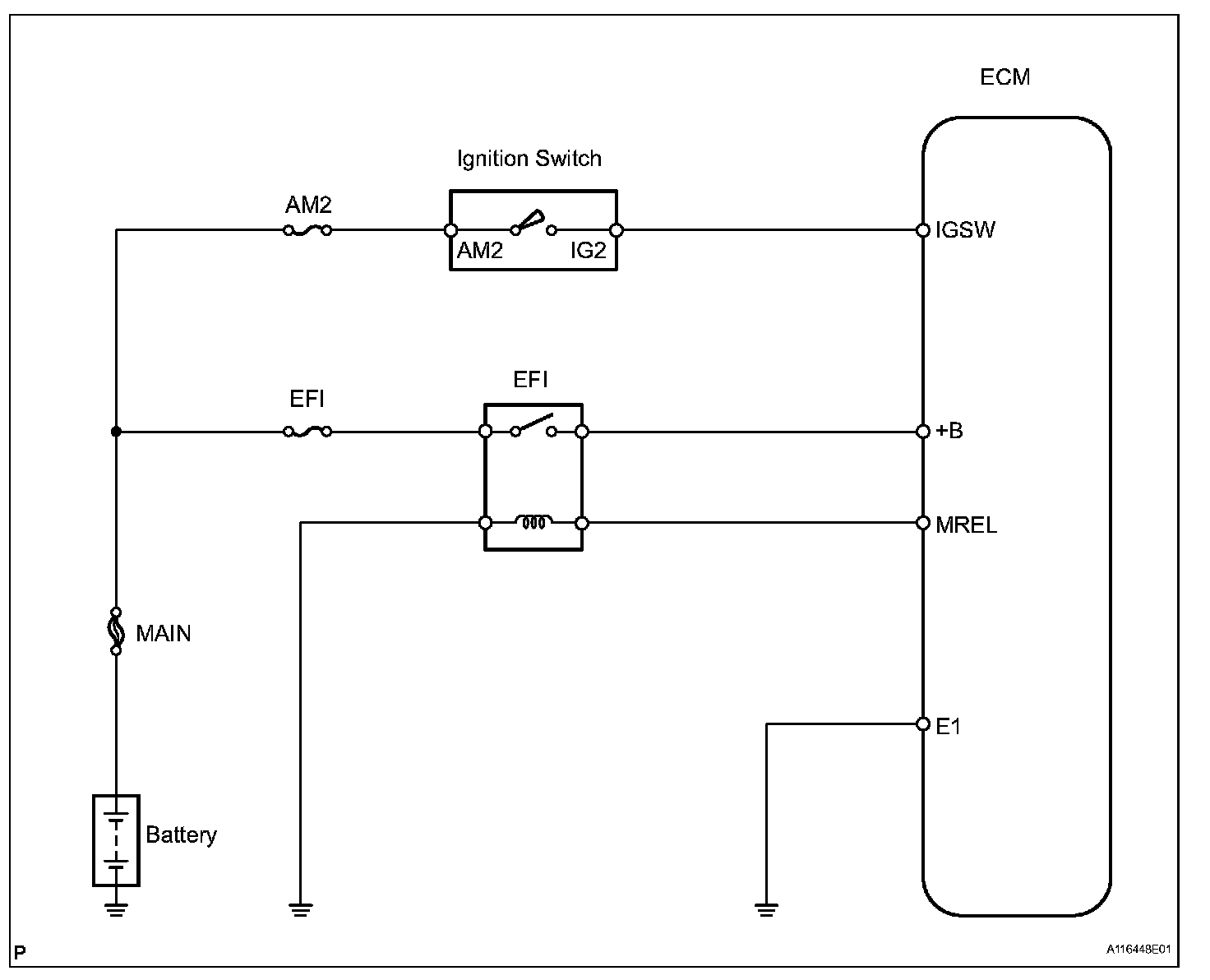 When the ignition switch is turned ON, the positive battery voltage is applied to terminal IGSW of the ECM. The ECM MREL output signal causes a current to flow to the coil, closing the contacts of the EFI relay (Marking: EFI) and supplies power to terminal +B of the ECM.