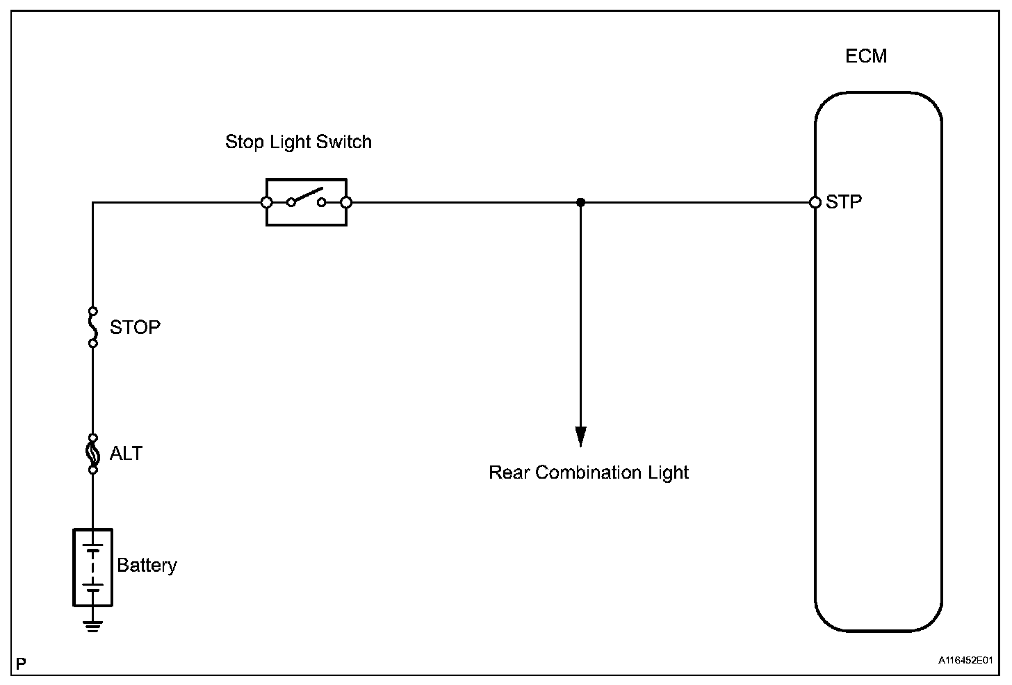 When the brake pedal is depressed, the stop light switch turns on and transmits an STP signal to the ECM. Upon receipt of the STP signal, the ECM determines that the brakes have been applied. The signal voltage level is the same as that of the voltage which is applied to the stop lights. In addition, the STP signal is used to control the fuel cut-off engine speed. Therefore, the fuel cut-off engine speed is slightly reduced when the vehicle is braking.