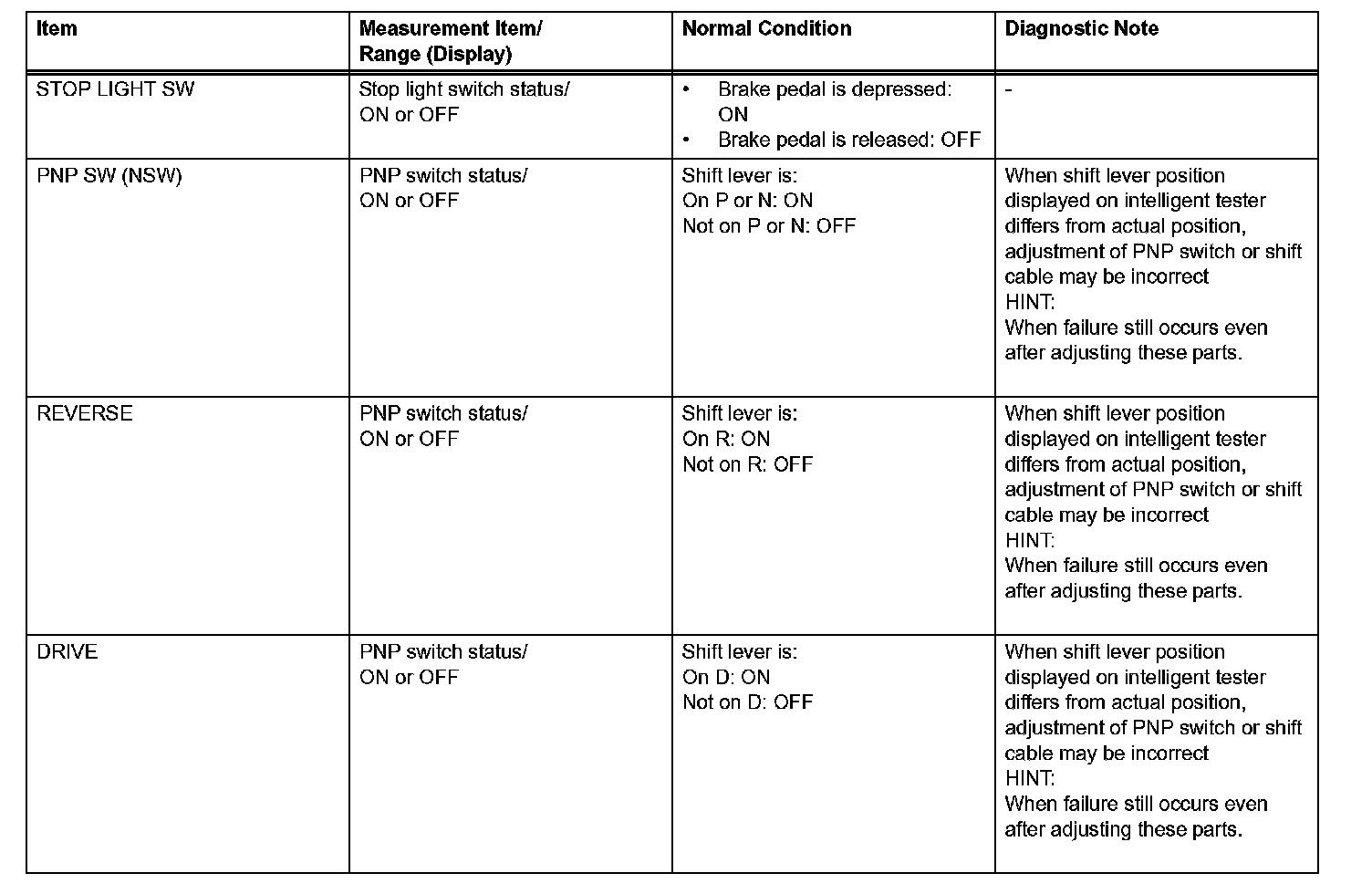 HINT: Using the intelligent tester's DATA LIST allows switch, sensor, actuator, and other item values to be read without removing any parts. Reading the DATA LIST early in troubleshooting is one way to save time.