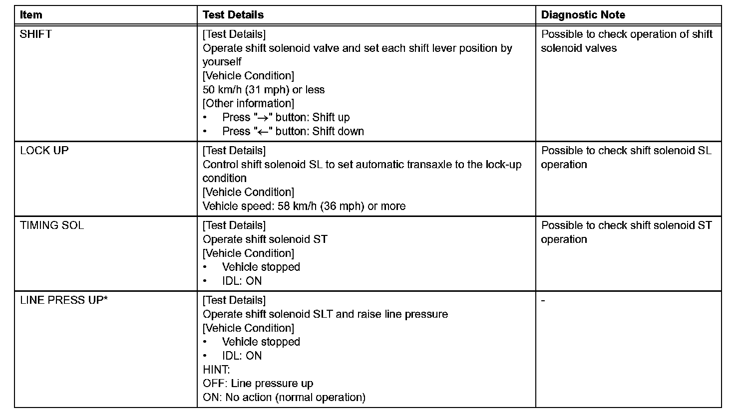*: LINE PRESS UP in the ACTIVE TEST is performed to check the line pressure changes by connecting SST to the automatic transaxle, which is used in the HYDRAULIC TEST as well. Please note that the pressure values in the ACTIVE TEST and HYDRAULIC TEST are different.