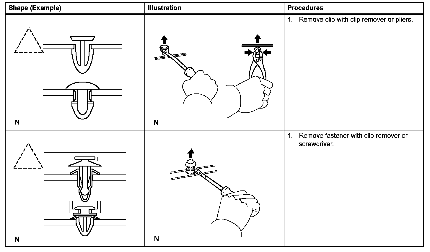 1. The removal and installation methods of typical clips used for vehicle body parts are shown in the table.