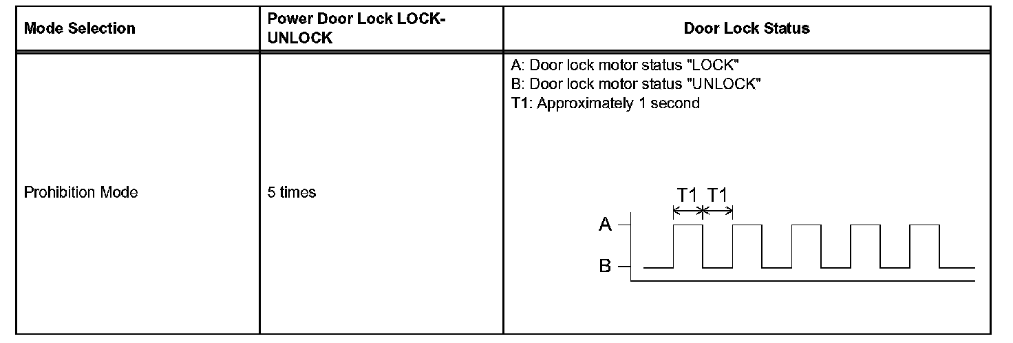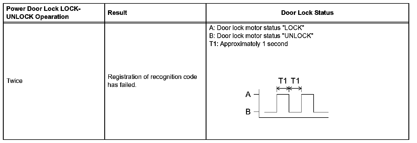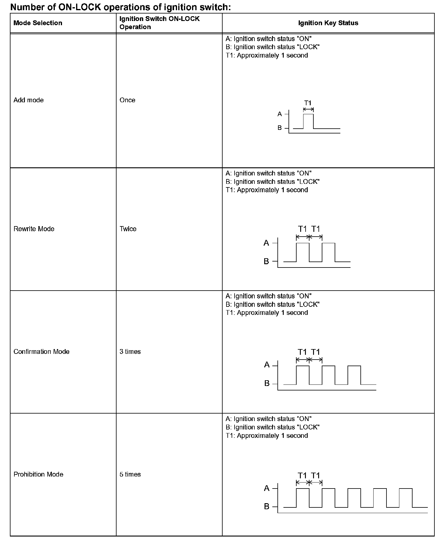 HINT: If the number of the ON-LOCK operations of the ignition switch is 0, 4 or 6 or more, there will be no response (power door LOCK-UNLOCK operation) to show which mode has been selected.