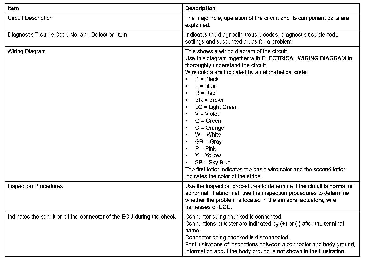 A description of the main areas of each circuit inspection.