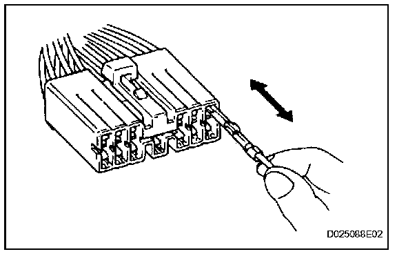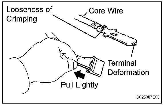 Check by pulling the wire harness lightly from the backside of the connector. Look for unlatched terminals, missing terminals, loose crimps or broken conductor wires. Check visually for corrosion, metallic or foreign matter and water, and bent, rusted, overheated, contaminated, or deformed terminals.