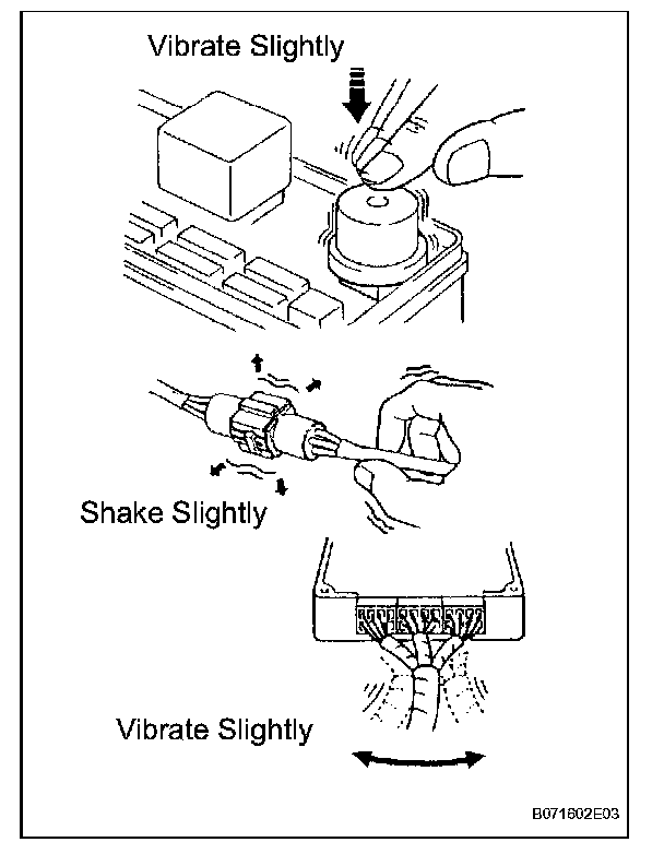 With a problem that only occurs when the engine is cold or as a result of vibration caused by the road during driving, the problem can never be determined if the symptoms are being checked on a stationary vehicle or on a vehicle with a warmed-up engine. Vibration, heat or water penetration (moisture) is difficult to reproduce. The symptom simulation tests below are effective substitutes for the conditions and can be applied on a stationary vehicle. Important points in the symptom simulation test: