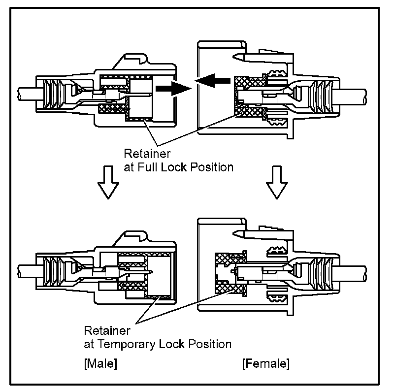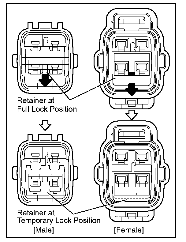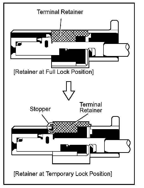 Insert the special tool into the terminal retainer access hole (Mark) and pull the terminal retainer up to the temporary lock position.