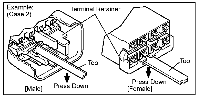 HINT: To remove the terminal from the connector, please construct and use the special tool or like object as shown.