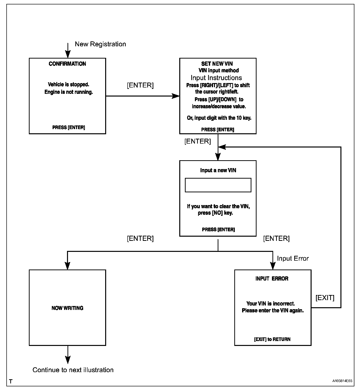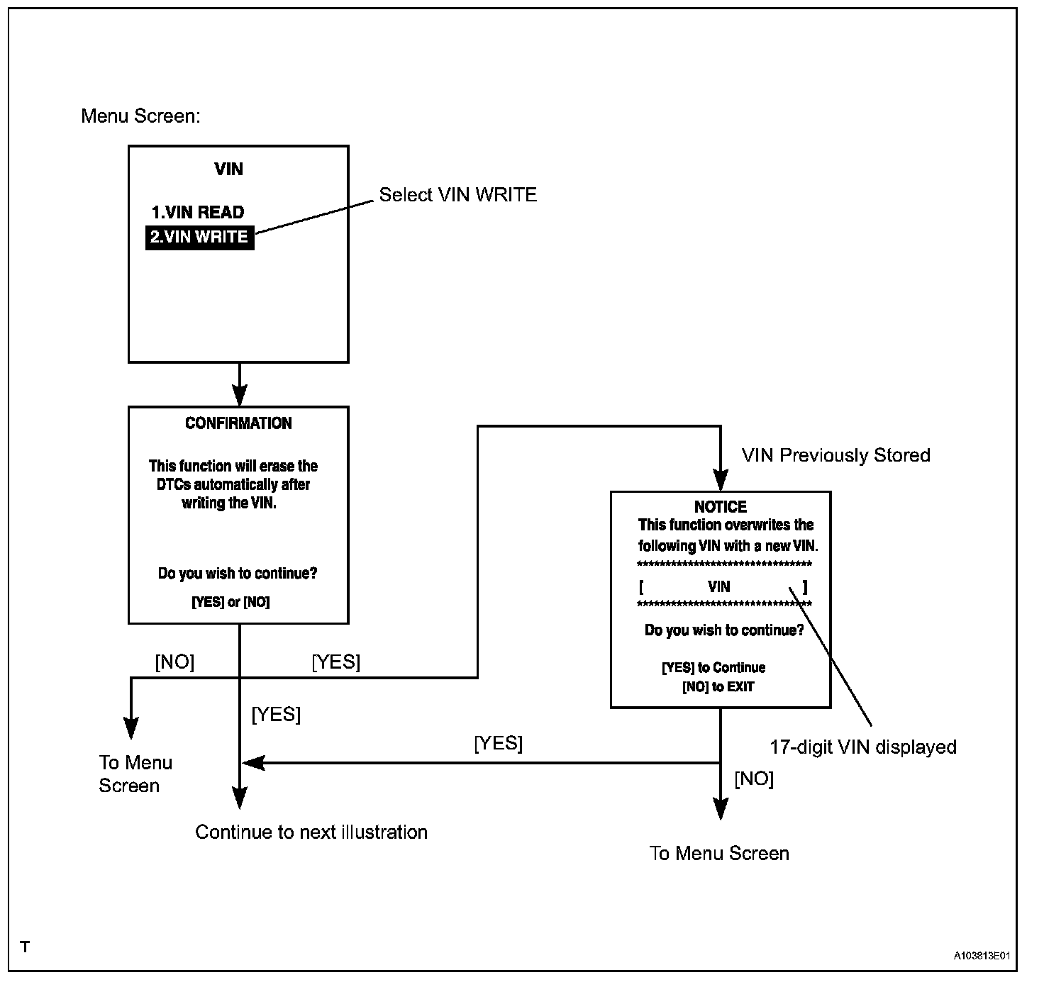 a. The VIN writing process is explained in a flowchart. This process allows the VIN to be input into the ECM. If the ECM is changed, or the 2 VINs do not match, the VIN can be registered, or overwritten in the ECM by following this procedure.