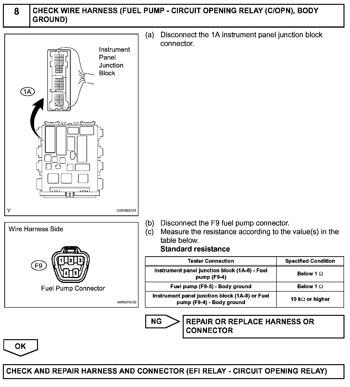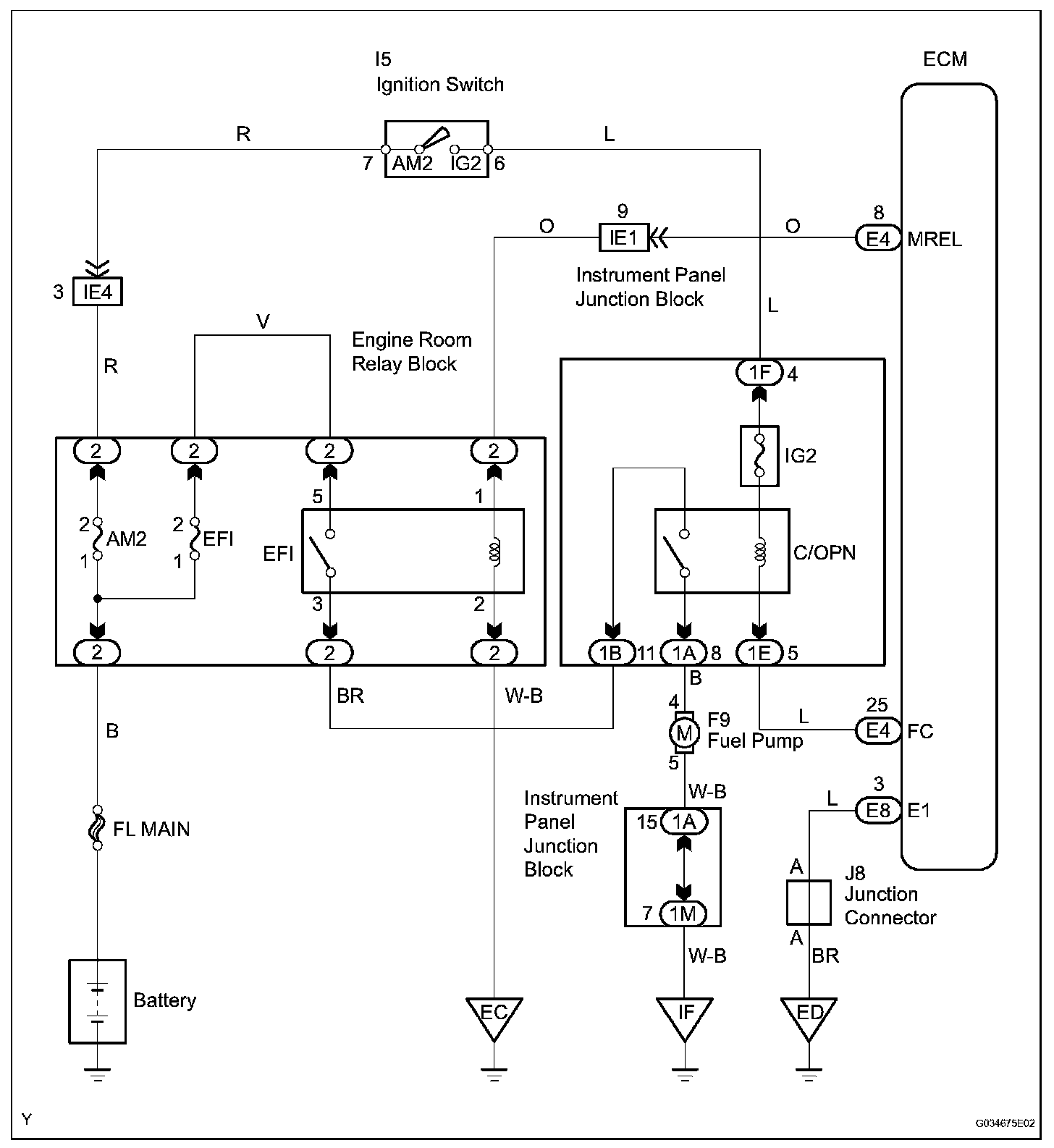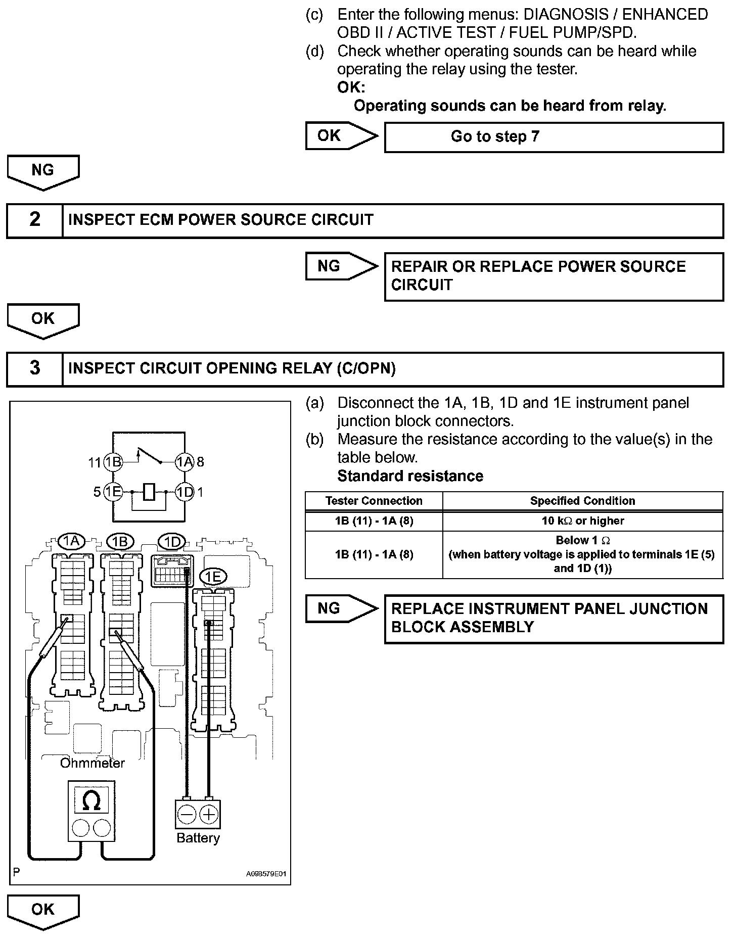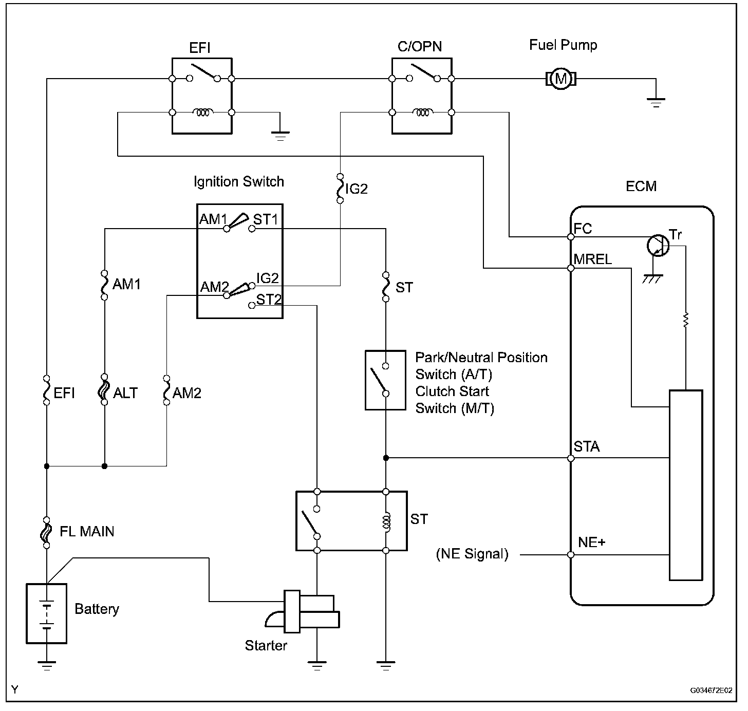 When the STA and NE signals are received by the ECM, Tr (power transistor) is switched ON, allowing a current to flow into the circuit opening relay coil. The circuit opening relay (Marking: C/OPN) switches ON, power is supplied to the fuel pump and the fuel pump operates.