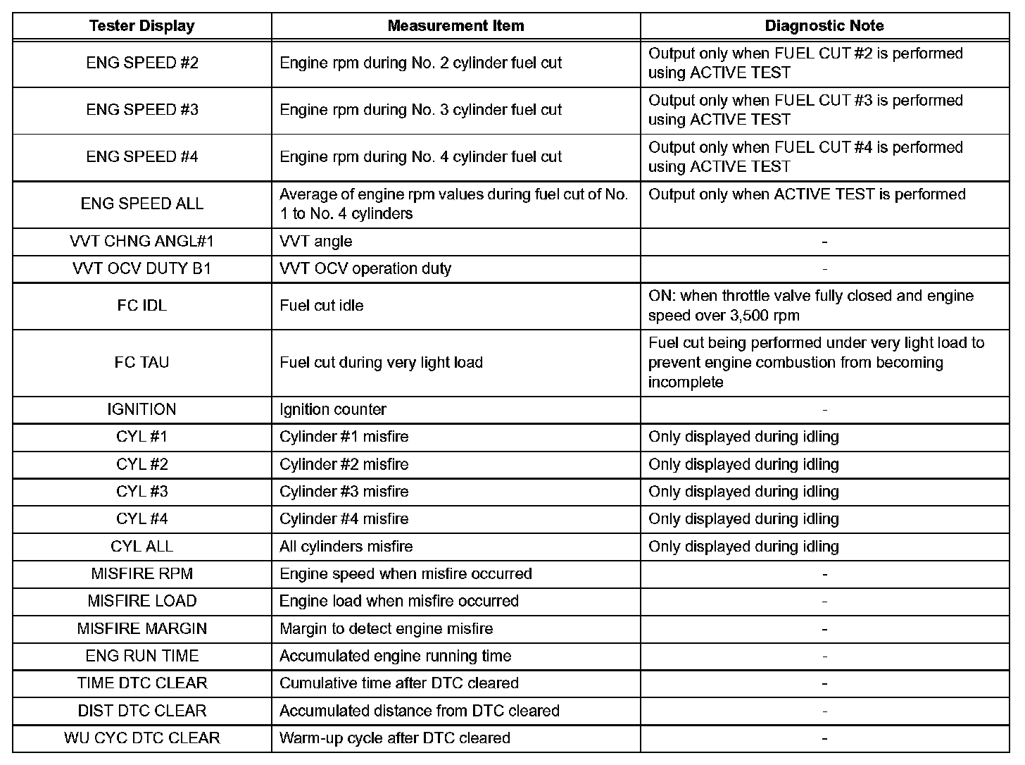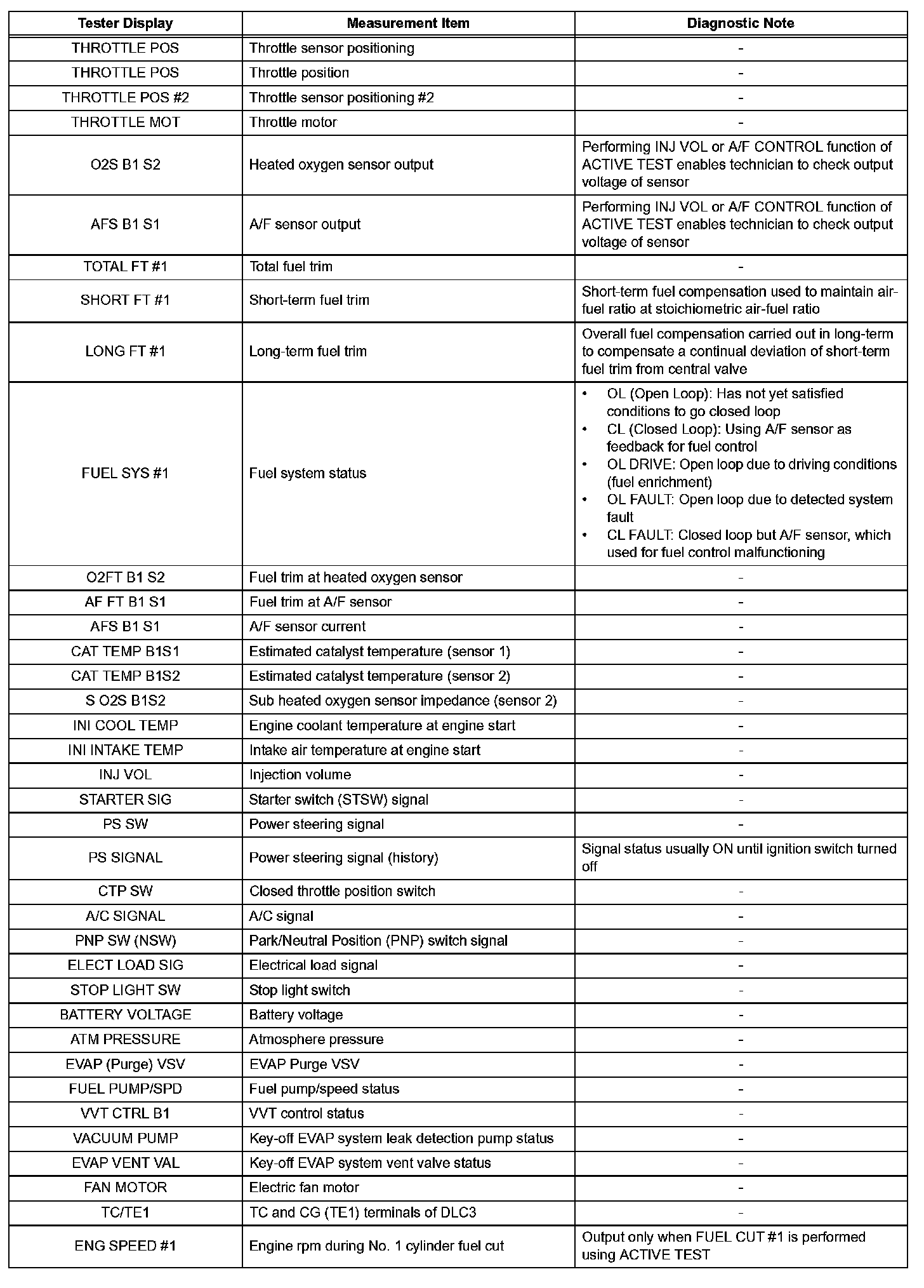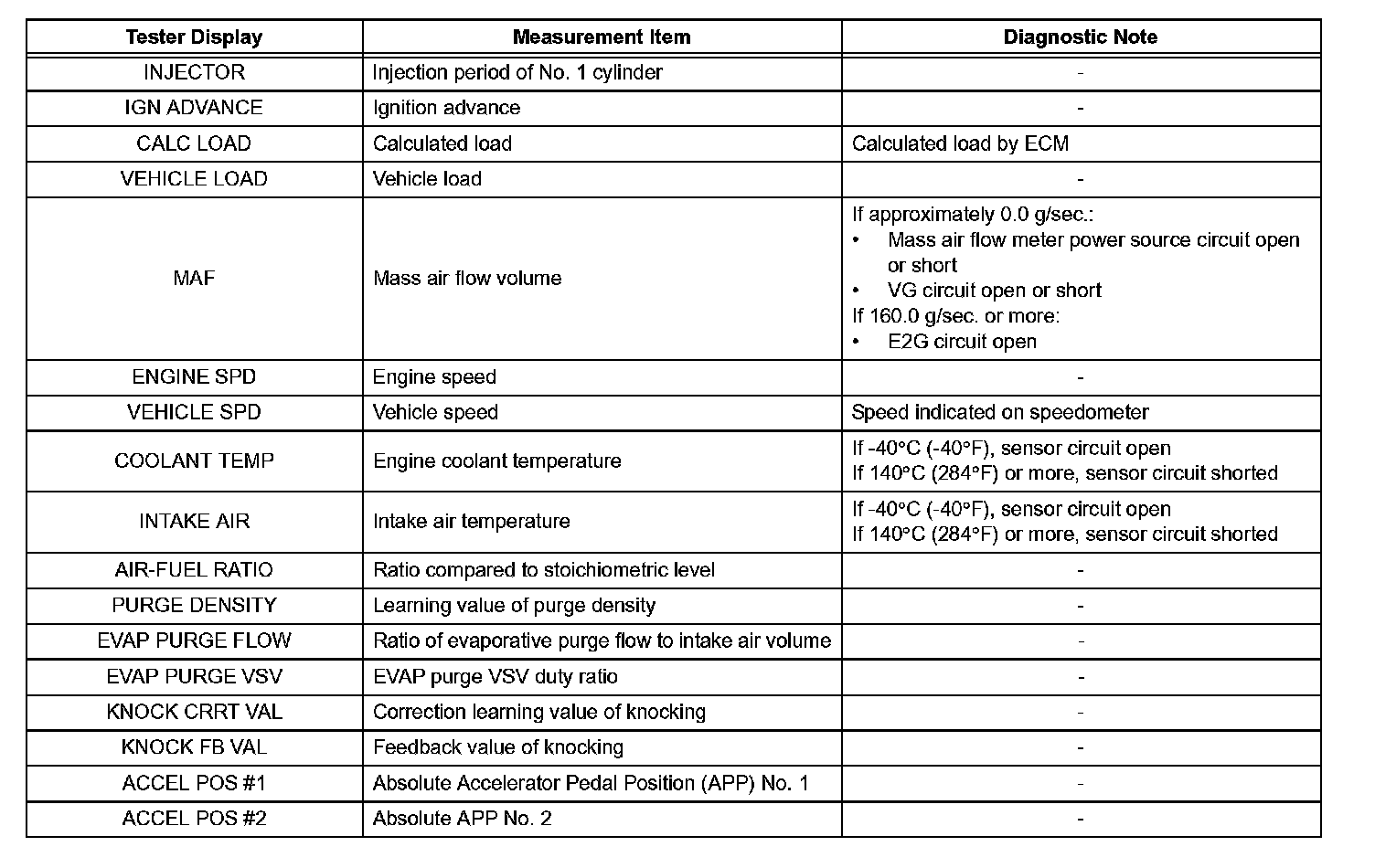 Freeze frame data records the engine conditions (fuel system, calculated load, engine coolant temperature, fuel trim, engine speed, vehicle speed, etc.) when a malfunction is detected. When troubleshooting, it can help determine if the vehicle was running or stopped, the engine was warmed up or not, the air-fuel ratio was Lean or Rich, and other data from the time the malfunction occurred.