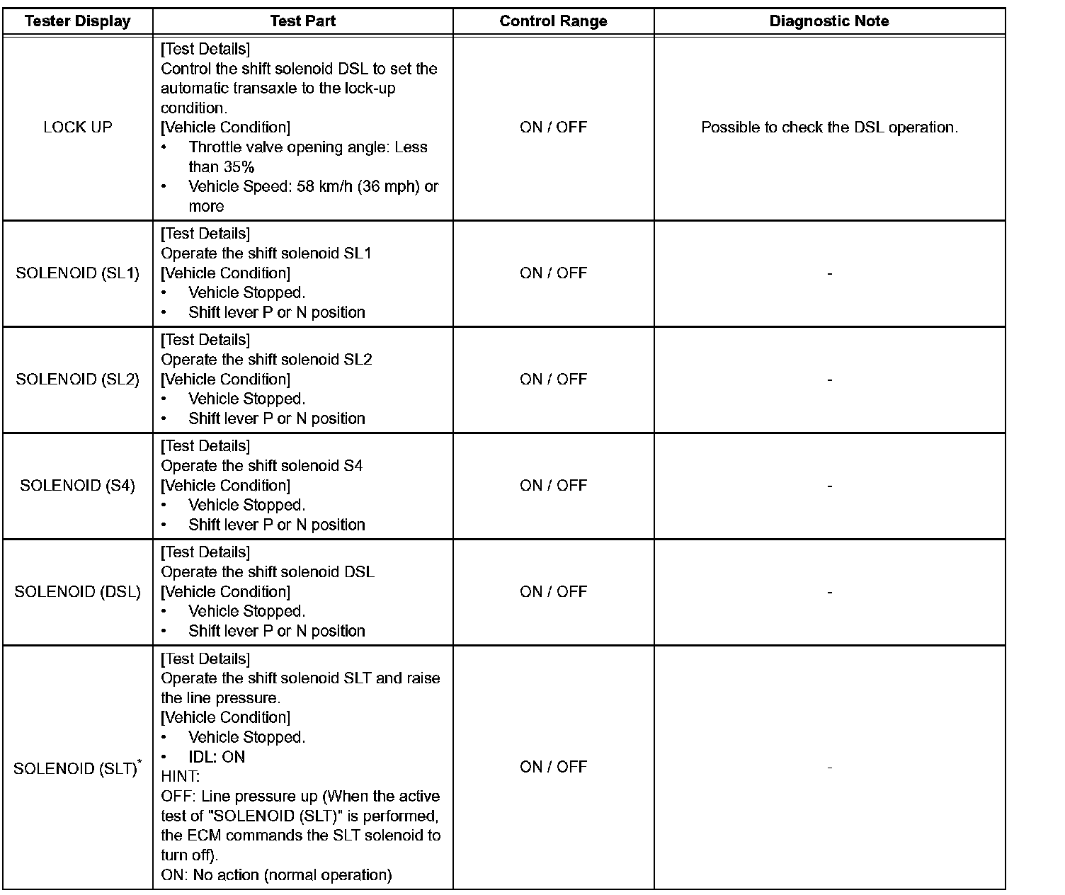 : "SOLENOID (SLT)" in the ACTIVE TEST is performed to check the line pressure changes by connecting the SST to the automatic transaxle, which is used in the HYDRAULIC TEST as well. Hydraulic Test