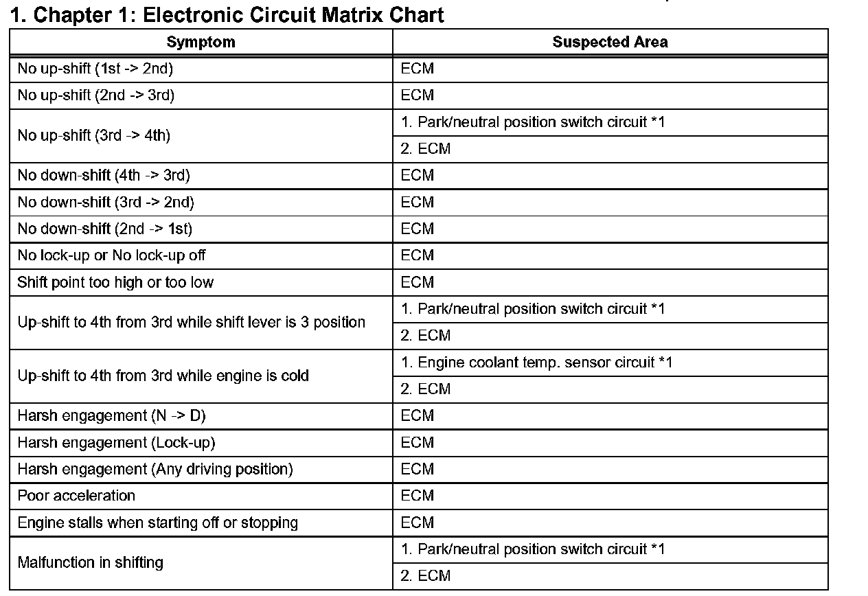Refer to the table below when the trouble cause is considered to be electrical the instruction "Proceed to next circuit inspection shown on matrix chart" is given in the flow chart of each circuit, proceed to the circuit with the next highest number in the table to continue the check. If the trouble still occurs even though there are no abnormalities in any of the other circuits, check and replace the ECM.