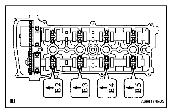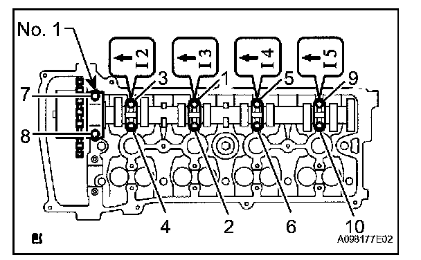 Examine the front marks and numbers and check that the order is as shown in the illustration. Then install the bearing caps onto the cylinder head.
