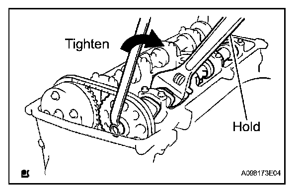 While holding the camshaft with a wrench, tighten the camshaft timing sprocket set bolt.