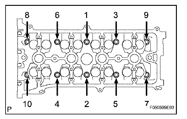 Cylinder HeadUsing several steps, uniformly install and tighten the 10 cylinder head bolts and plate washers with a 10 mm bi-hexagon wrench in the sequence shown in the illustration.