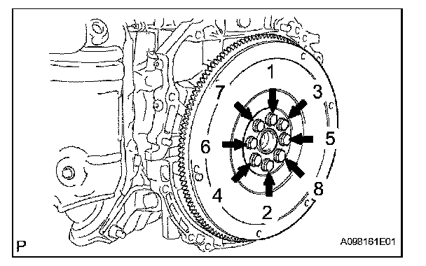 Using several steps, uniformly install and tighten the 8 bolts in the sequence shown in the illustration.