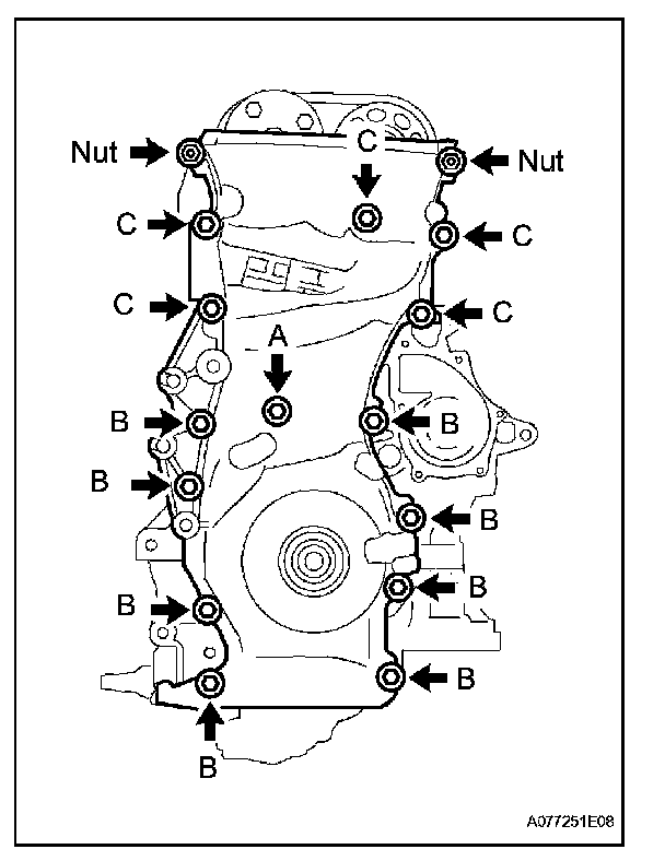 Install the timing chain cover with the 14 bolts and 2 nuts.