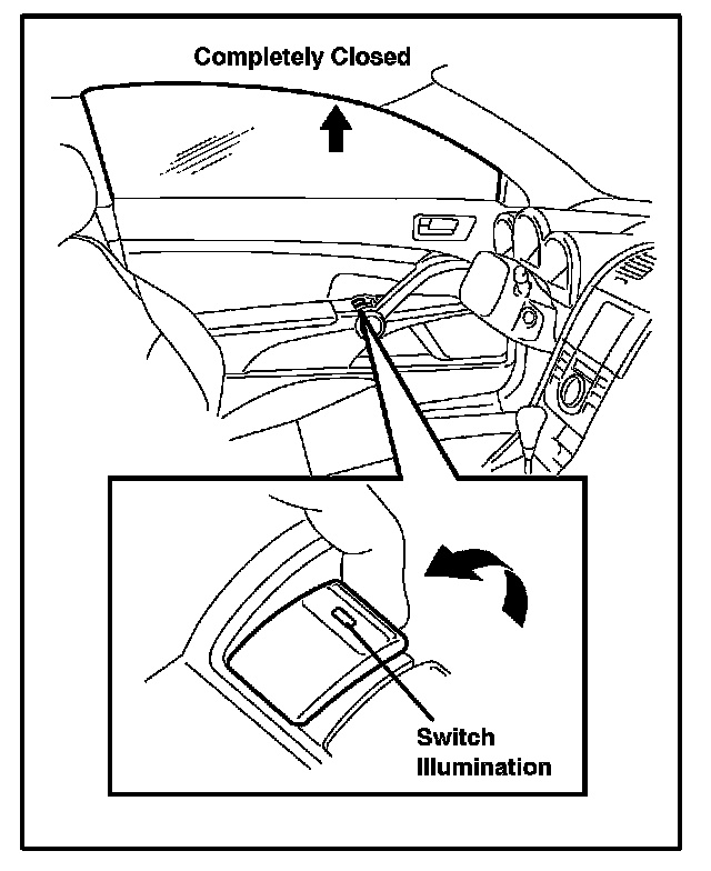 2. Pull up the driver's door power window switch until the window closes, and hold it for approximately one second until the switch changes from blinking to a constant illumination.