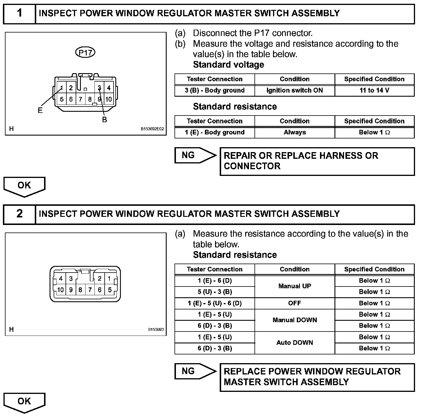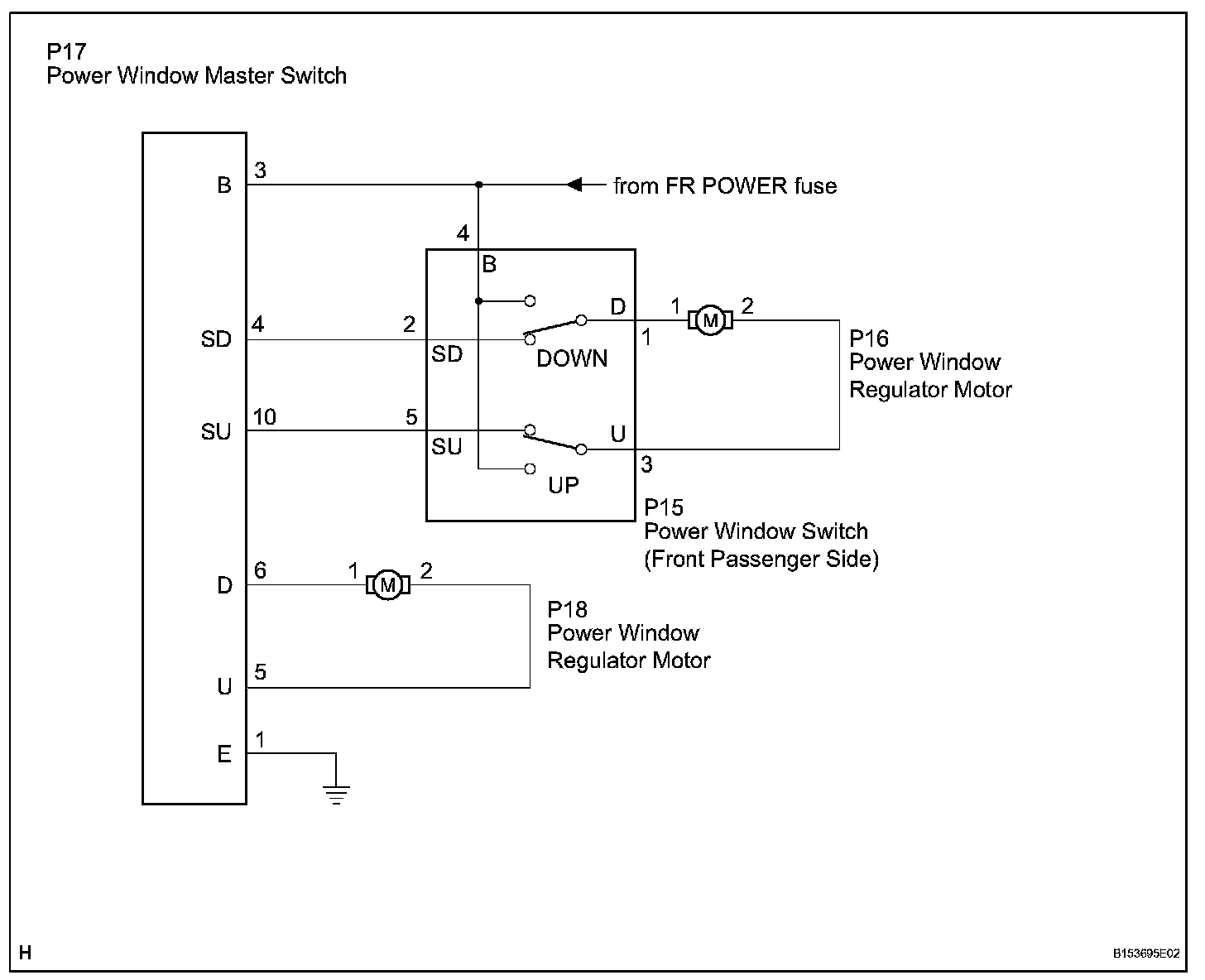 This circuit transmits signals from the power window regulator master switch assembly to the power window regulator switch.
